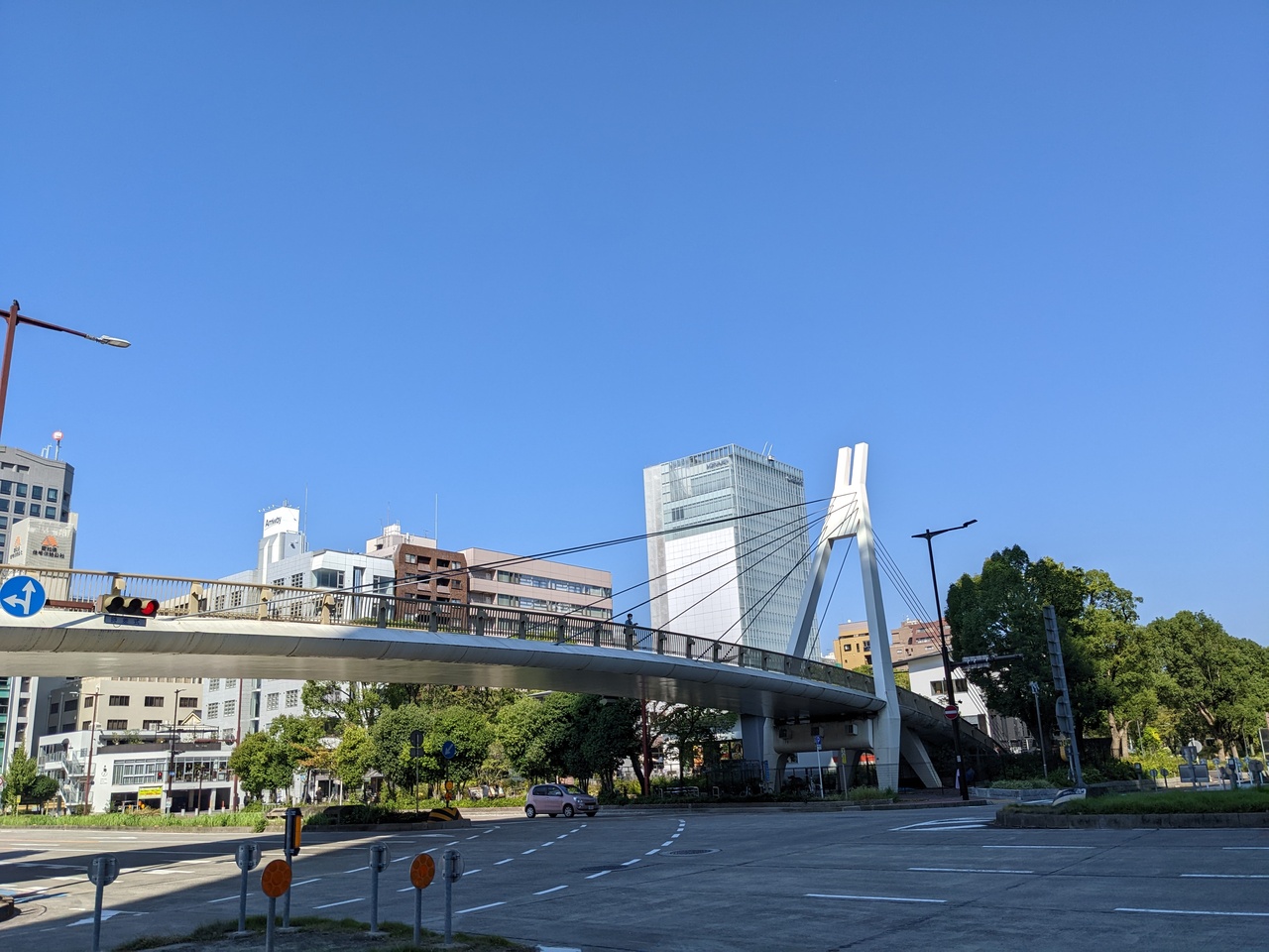 名古屋の中心地にある久屋大通公園に架かる橋です。桜通りと交差するところに架かる吊り橋型のかなり立派な橋なので見ごたえがありました。中部電力ミライタワー(名古屋テレビ塔)からも近くにある歩行者専用の橋なので、久屋大通公園を散策する際は是非渡ってみてください。