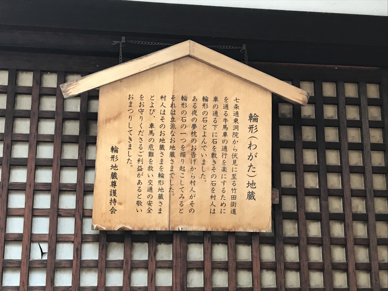 正行院 輪形地蔵は、JR京都駅から東へ徒歩3分くらいの場所にあります。正行院は、天文七年(1538)猿にまで南無阿弥陀仏の名号を与えた円誉上人の開創です。本堂には膝上に合掌猿をのせた円誉上人像が祀られています。災難除けの「猿寺」として信仰を集めています。お寺の看板にも「さるでら」と書いてありました。門前に輪形地蔵堂があります。お寺への参拝は出来ないですが、横にある輪形地蔵尊への参拝はできました。竹田街道を通る牛車の通行を楽にするための車の通る下に石を敷いた。その石が輪型の石と呼ばれていて、その石のひとつを掘り起こしたところお地蔵さんがでてきたそうです。昔から「交通安全の守護」として広く信仰されてきました。色々なエピソードがあり、現地で説明を見ると楽しめるお寺でした。