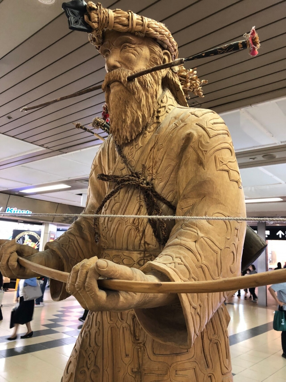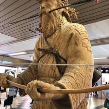 アイヌ民族の姿をした木の像です。口には矢をくわえている姿です。