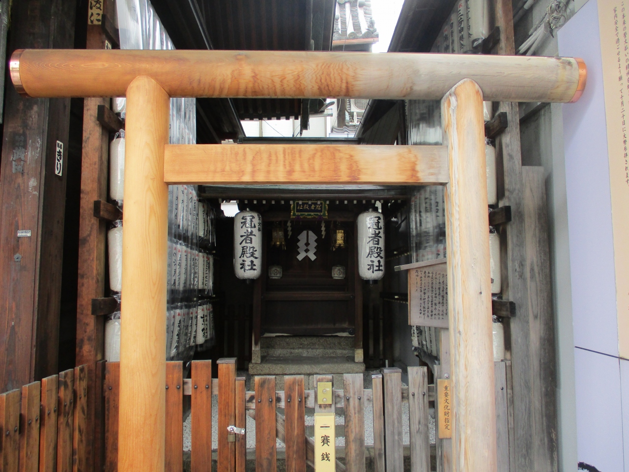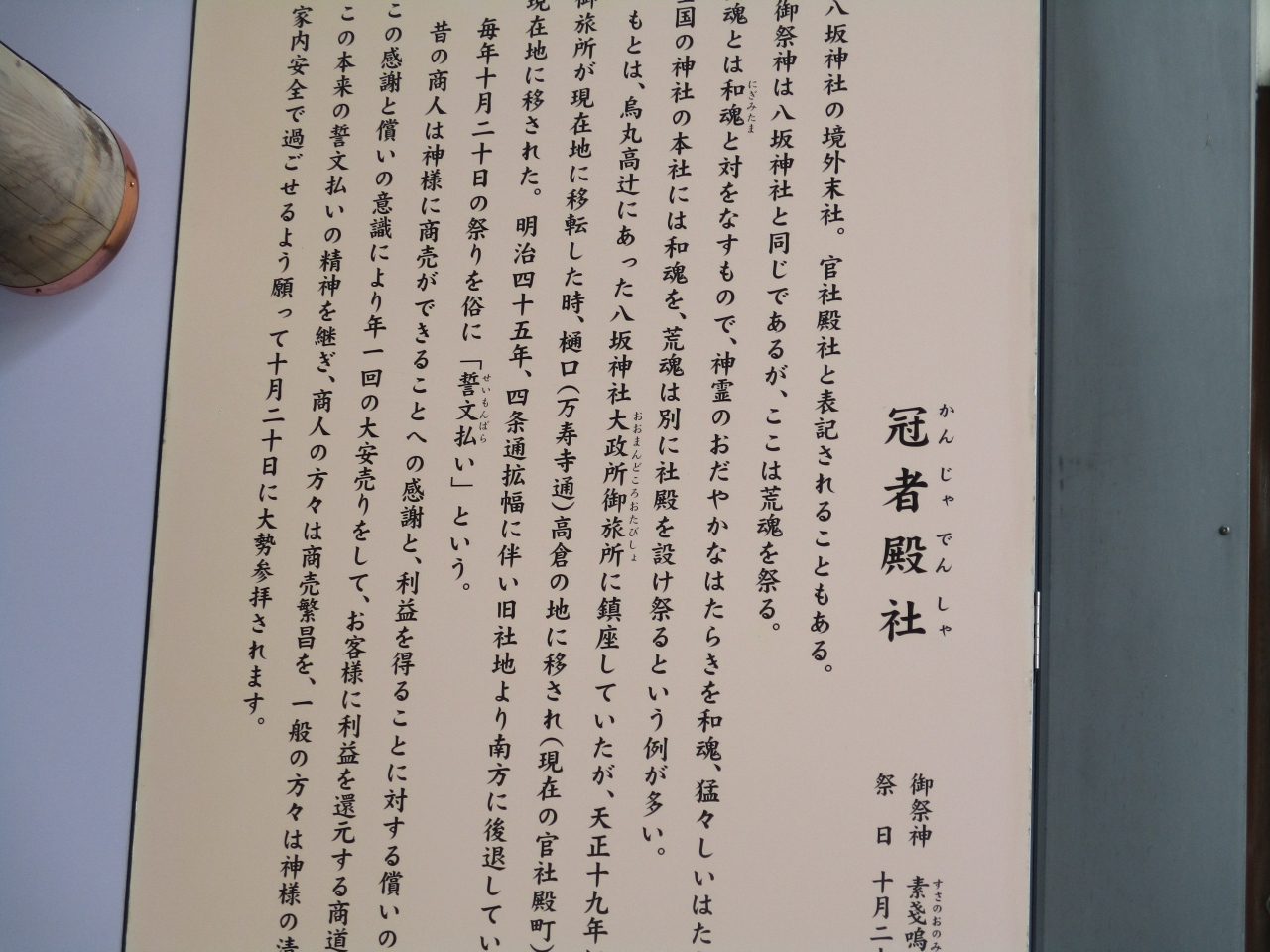 四条通のにぎやかな場所にあるこじんまりとした神社です。八坂神社の場外摂社です。説明板が大きくて読みやすいです。創建不明、素戔嗚尊の荒魂を祀っています。「誓文払い」のご利益があります。お商売に関係し、歳末大売り出しの発祥となった神社です。