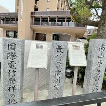 ANAクラウンプラザホテル前にある敷地に並んで建つ3本の石碑のうち、真ん中にあります。明治初期、この場所に開局された長崎電信局と東京電信局との間で初めて国内電報が行われたそうです。左側には国際電信発祥地という石碑が建っていて、長崎が当時国際化の最先端だったことがよくわかりました。