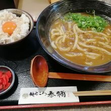 会社の人がランチしてきたと聞いて、平日の13時すぎに初めて訪れてみました。カウンターと、奥にテーブル席があるようです。名物のカレーうどんと卵かけご飯のセットにしました。卵かけご飯にはだし醤油が予め掛かっているのですが、私には味が物足りなかったので醤油が欲しかったです。カレーうどんはまずまず。ペイペイ使えました。