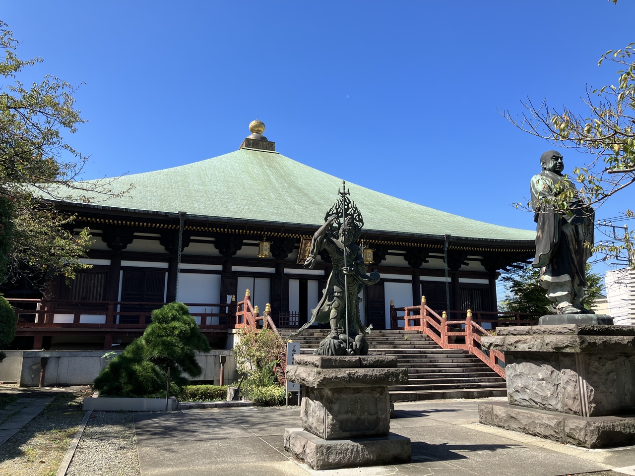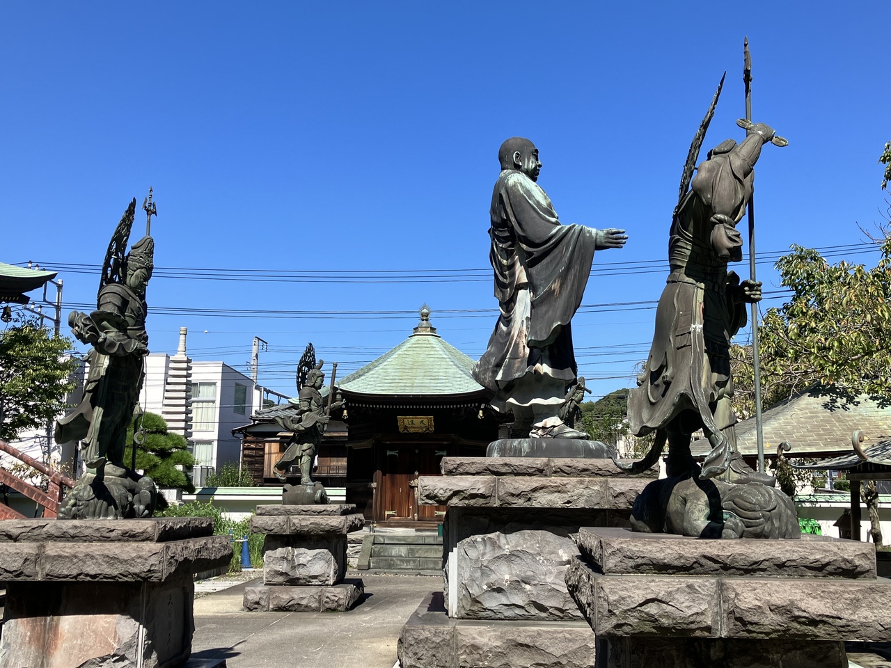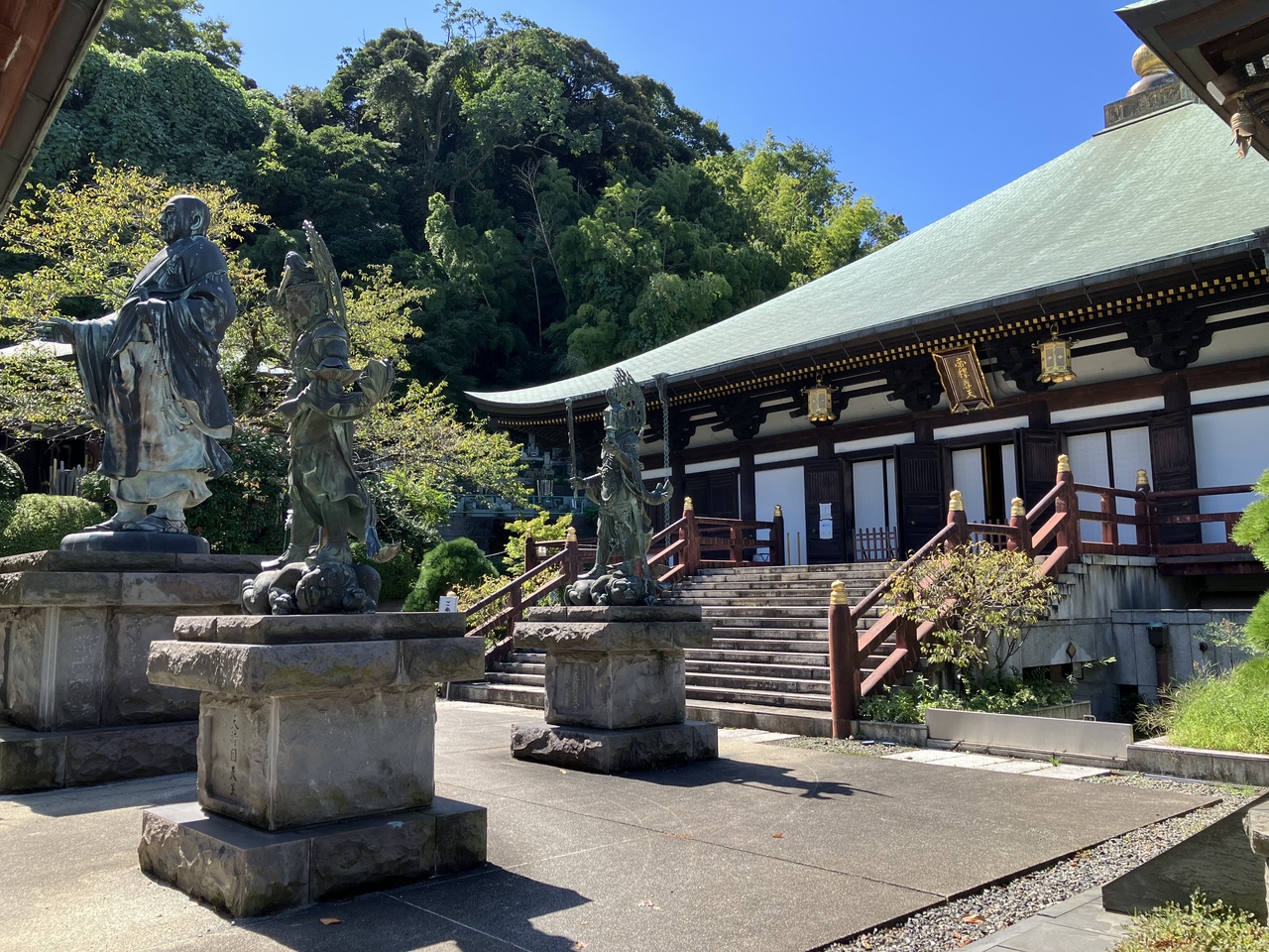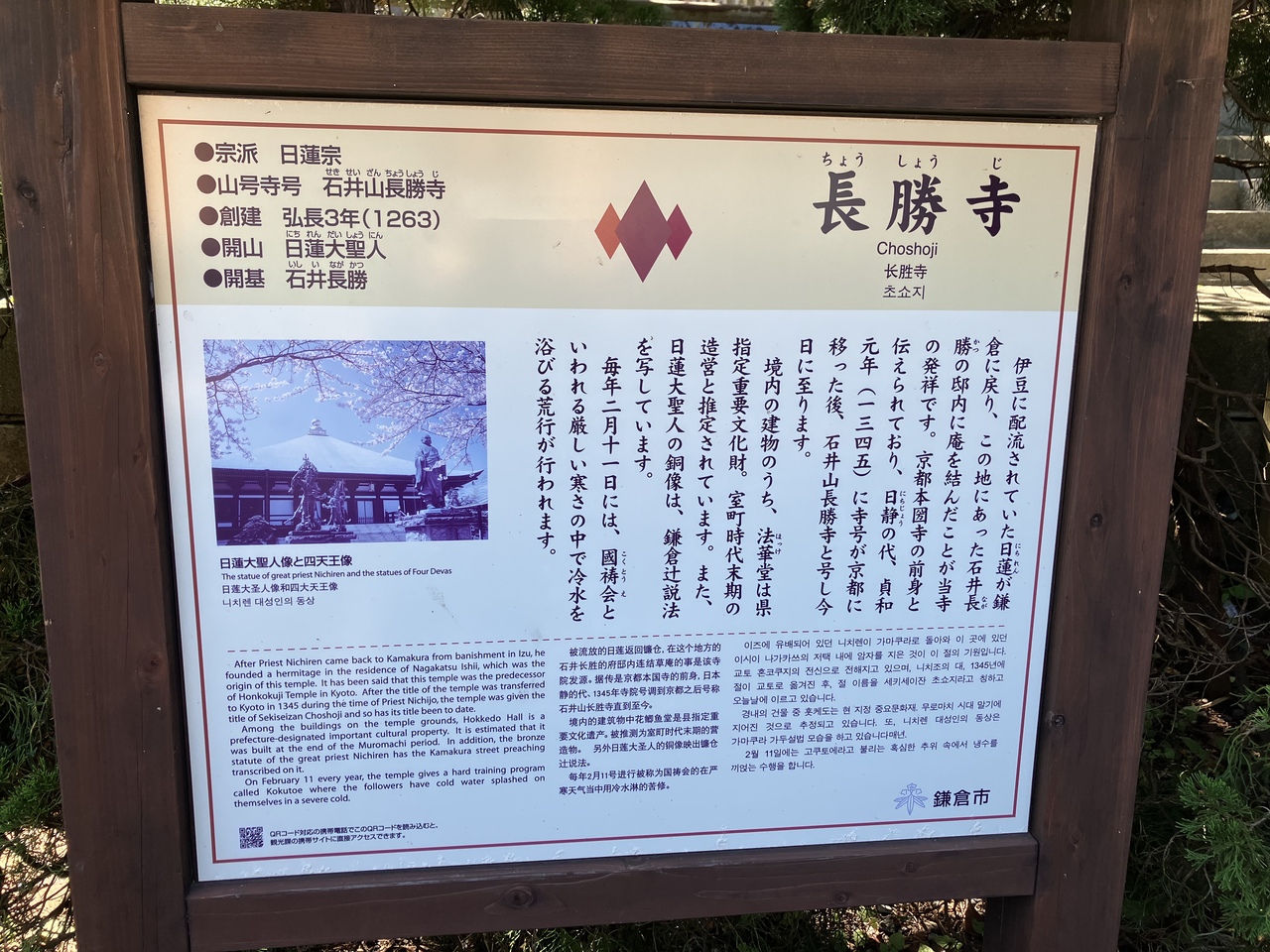 鎌倉駅東口から京急バス「名越・逗子駅行き」で「長勝寺」下車しすぐです。とても大きい寺院でした。伊豆に配流されていた日蓮上人が鎌倉に戻りこの地の石井長勝の邸内に庵を結んだことにが発祥と言われています。境内の「法華三昧堂」は県重要文化財に指定されています。また本堂前の日蓮聖人像は日本を代表する彫刻家高村光雲の作品です。日蓮聖人の風格が感じられる名品です。