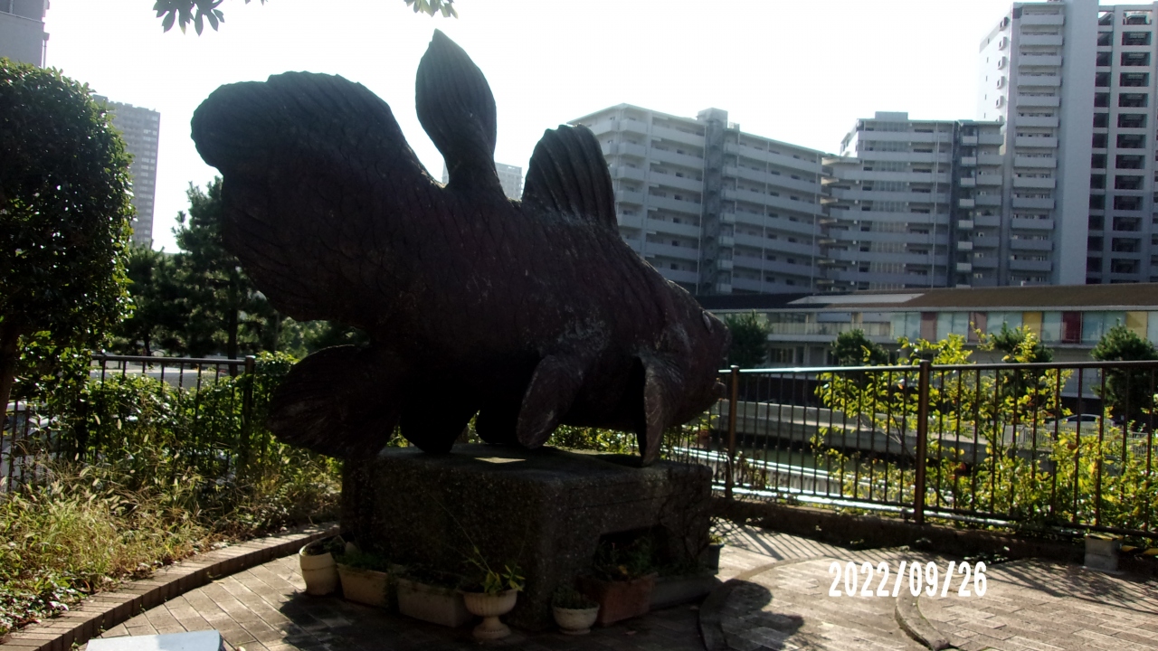 この幸福の魚・GOMBESSAはモニュメントの名称です。小名木川にかかる西深川橋の北詰にあります。地下鉄都営大江戸線と東京メトロ半蔵門線清澄白河駅から北東に15分程度の場所です。このシーラカンスのモニュメントですが幸福の魚の名称は地元の人にも伝わっていないようです。でもモニュメント自体は存在感があります。