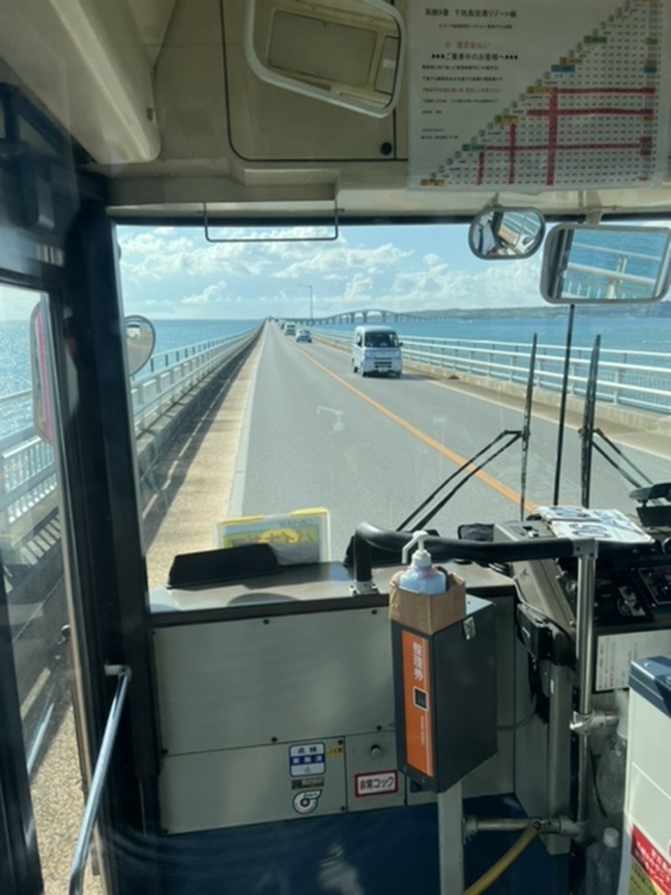 スカイマークエアラインの利用だったので下地島空港でした。宮古協栄バスで市街まで行き来する際に渡りました。綺麗な海が見渡せます。スキューバダイビングではボートで伊良部大橋を潜りましたよ。