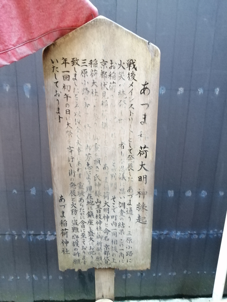 銀座コアビルのそば、三原小路という路地のなかにあるすごく小さなお稲荷さんです。火防・盗難よけにご利益があるそうです。おやしろの横に古びた看板が立っていて、字は見えづらくなっていますが、風情を感じます。