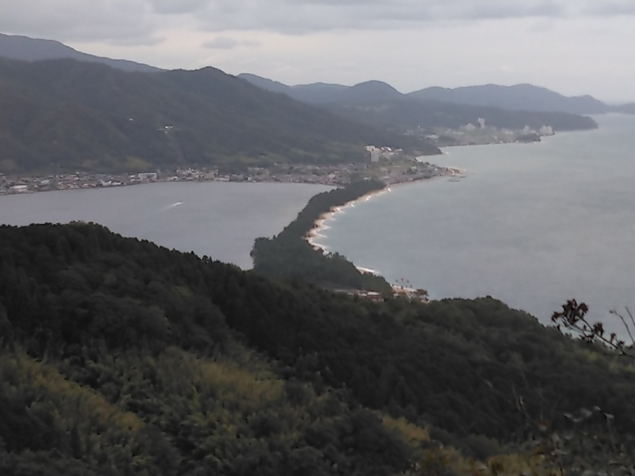 金引の滝から題目山に登ると、左手に天橋立が見えます。トレイル道となっていて、登山道は整備されていました。平岩山まで来ると、ちょうど正面に天橋立が見えます。最後に文殊山まで来ると、右手に天橋立が見えます。いい景色を楽しめます。
