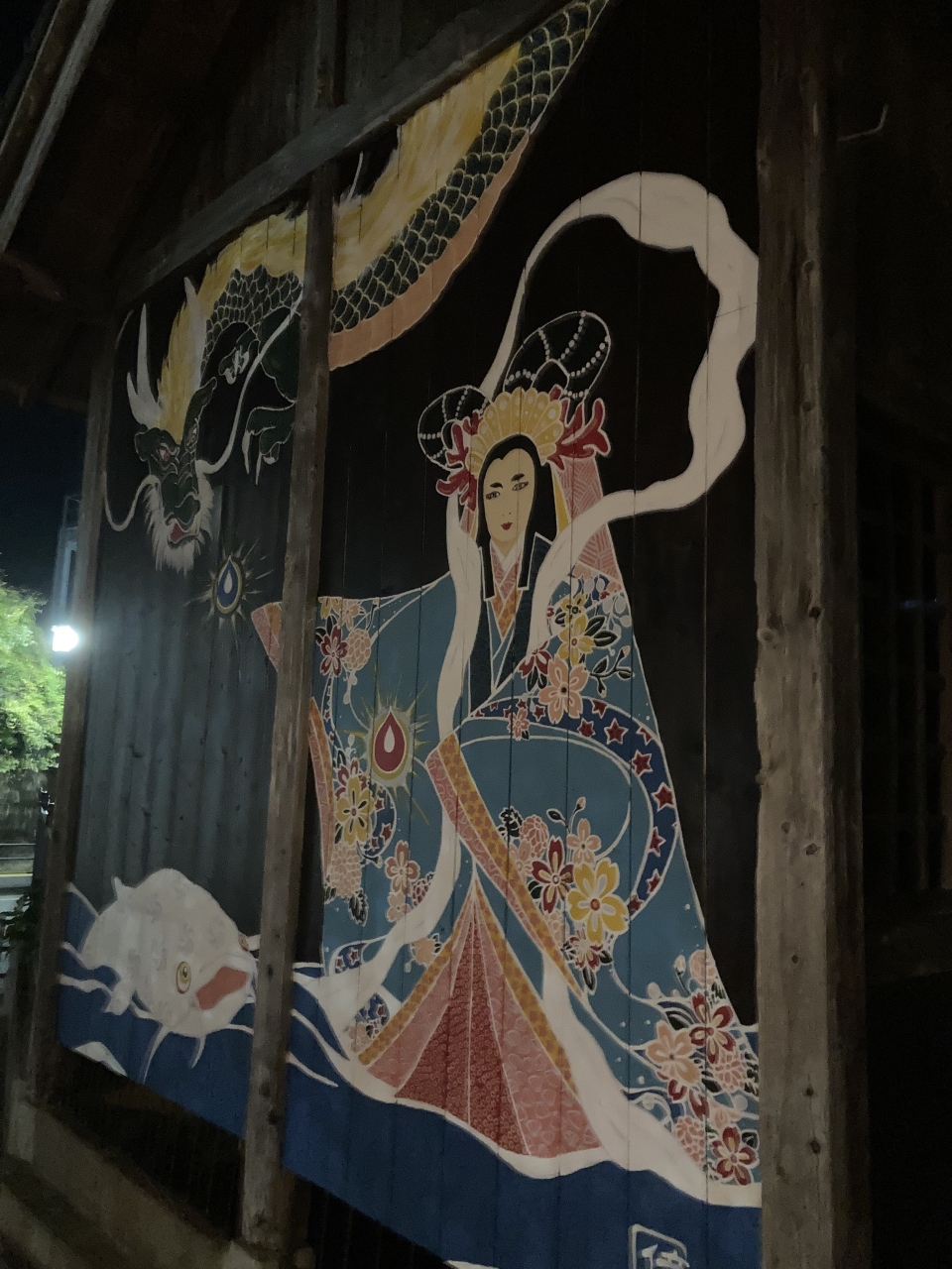 温泉街の中心に位置する神社に、2022年9月、西九州新幹線開業・新駅誕生(ちょっと遠いけど)を祝して?境内の建物の壁いっぱいに絵が描かれました。乙姫さまと白なまずと龍。街灯がちょうど照らす位置なので夜でも観賞できます。