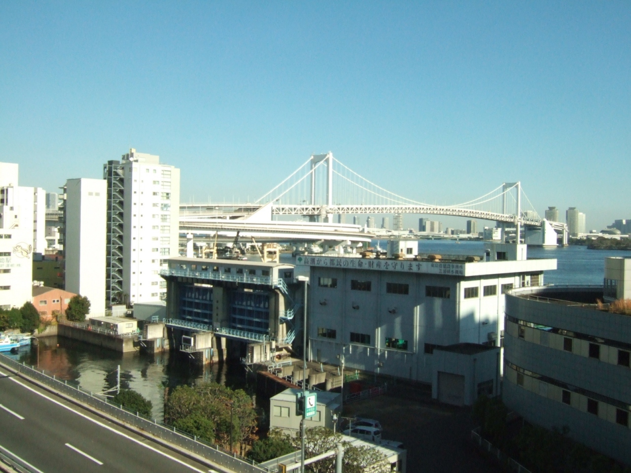 東京港の入り口、芝浦とお台場を結んでいるレインボーブリッジ。ゆりかもめに乗って渡ることもできますが、橋の下段を走り、しかも両側は道路なので眺めは良くありません。