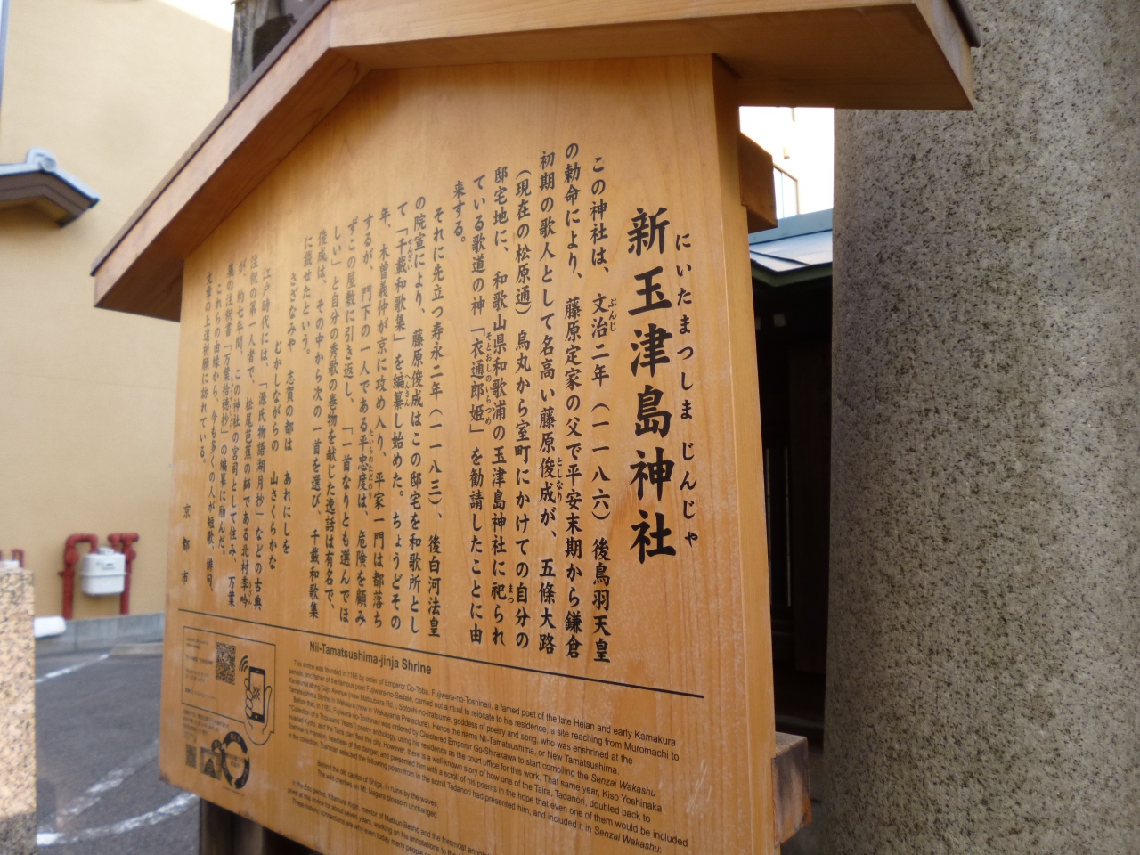 地下鉄の五条駅から歩いて5分ほどのところにある神社です。小さなビルの間にあるあまり大きくない神社です。藤原定家の父親で平安末期から鎌倉初期の歌人として名高い藤原俊成がここに居を構え和歌所としていたそうです。「千載和歌集」もここで編纂され、そういう由緒から現在も短歌、俳句、文章の上達祈願に訪れる方が多いようです。