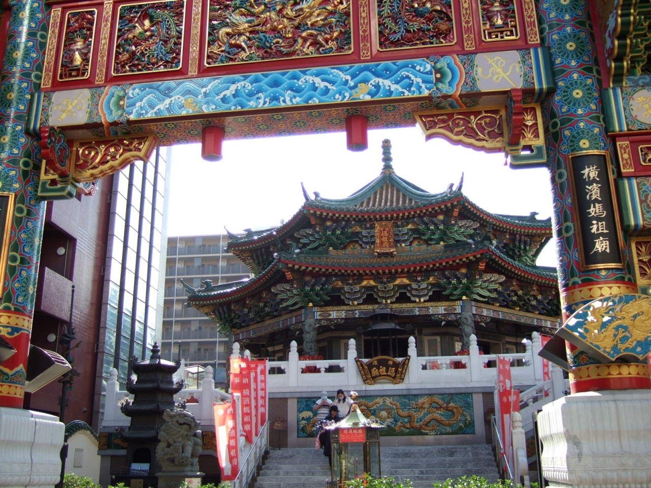 山下公園から横浜中華街に入り、南門シルクロードを歩いていると、右側にド派手な門が突然現れます。門の中にあるのが媽祖廟で、福建や台湾でよく崇敬されている媽祖娘娘をお祀りしています。