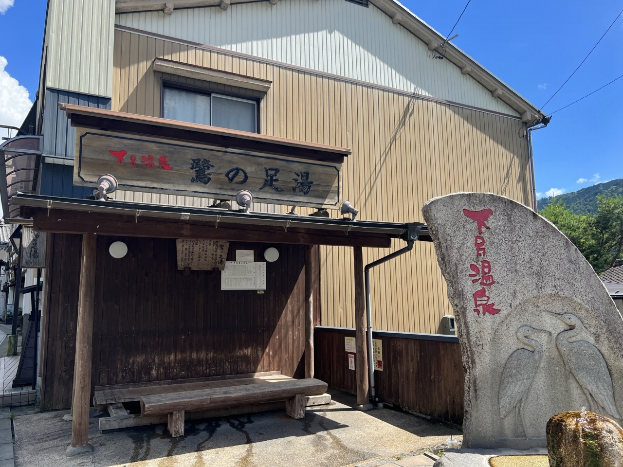 下呂温泉の中心、湯の街通りに面して「下呂温泉 鷺の足湯」と書かれた看板があります。長方形の足湯の両側に木のベンチがあり、3名ずつが腰掛けられるようになっています。足湯の横には、2羽の白鷺が描かれた石のレリーフがあります。