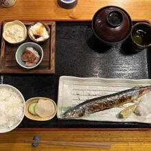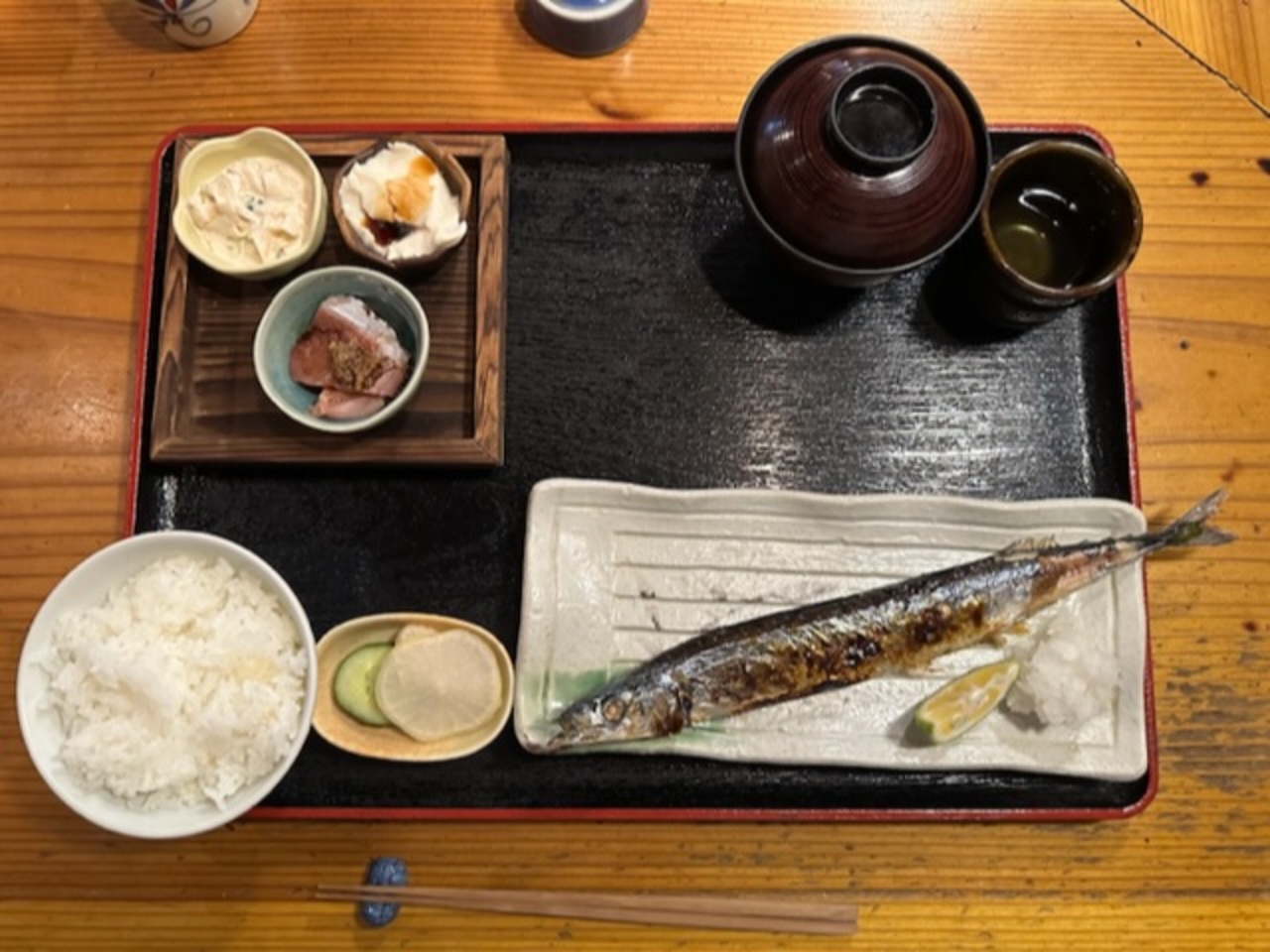 新さんまの定食、鶏天ぷら(美味)、小鉢3種(冷奴、鰤刺身、ツナサラダ)と味噌汁、ぬか漬(大根うまい)、ご飯と盛りだくさんです。