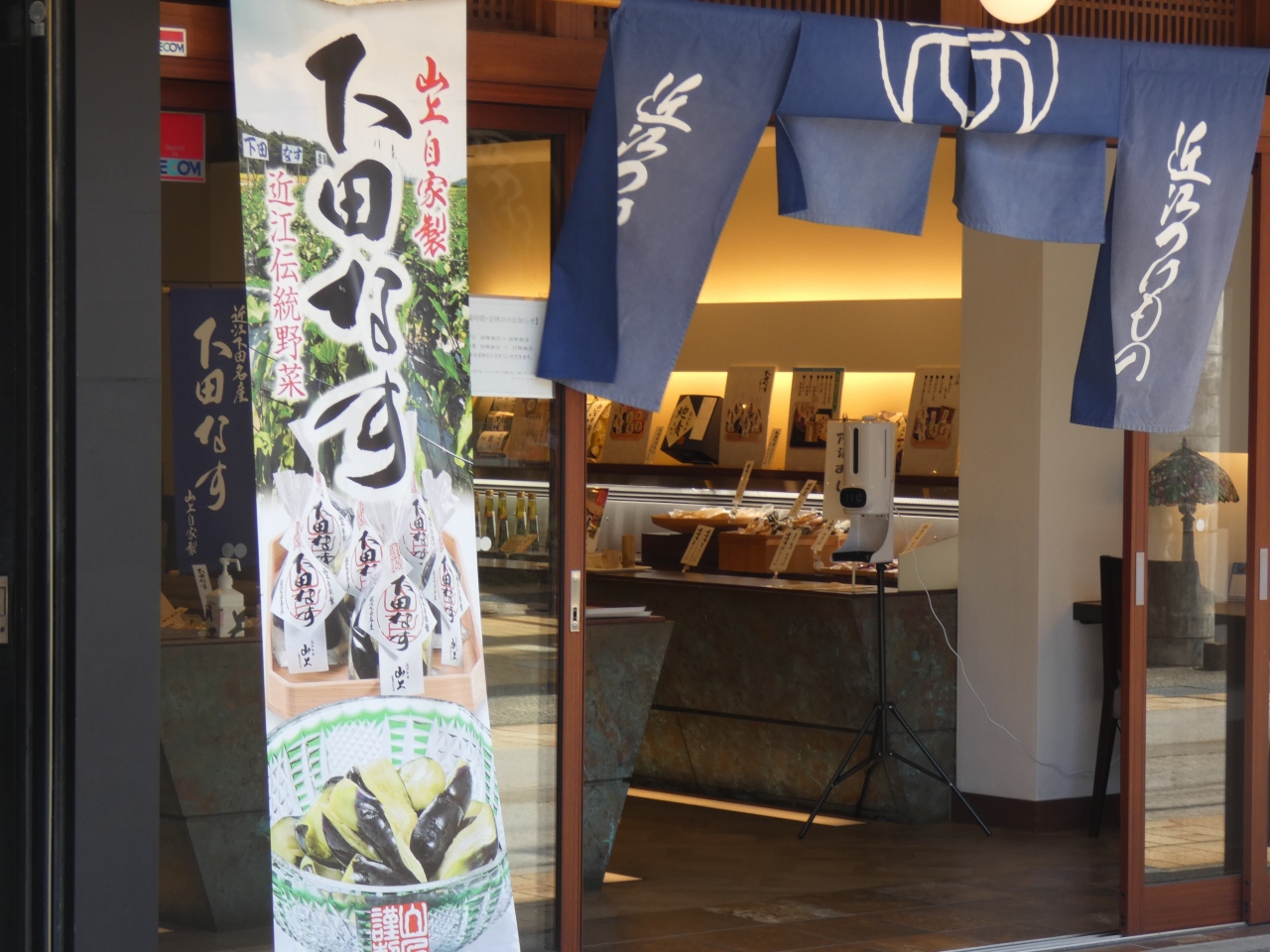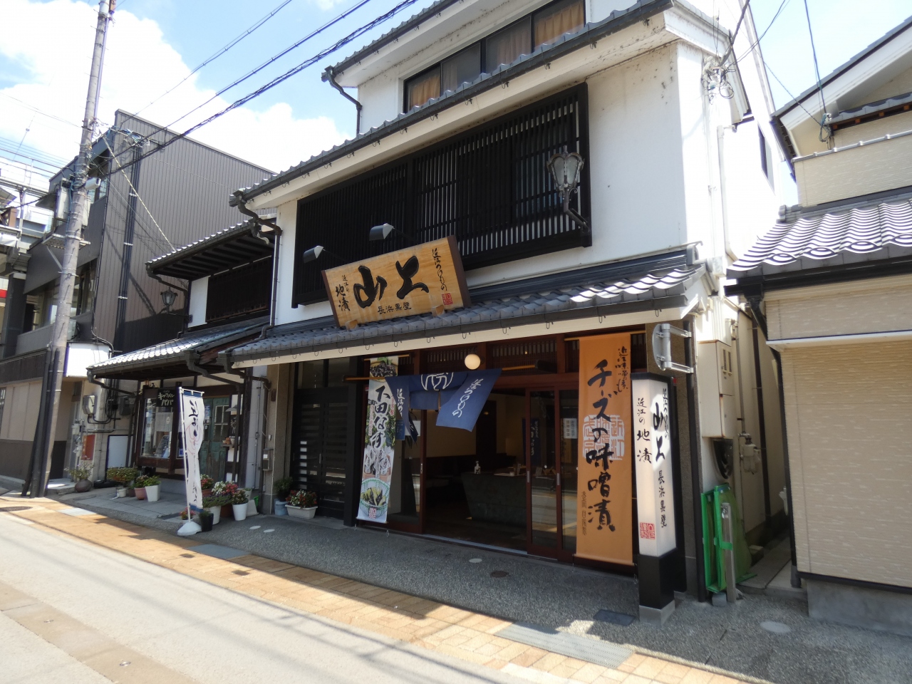 長浜大手門通り商店街の東から博物館通りに入った所にある近江漬物専門店。白壁の和風建築の店構えで格式を感じます。近江伝統野菜の漬物と味噌漬けが名物の様です。店頭には旬の下田なすの漬物が並んでいました。美味しい名物日野菜もありましたよ。