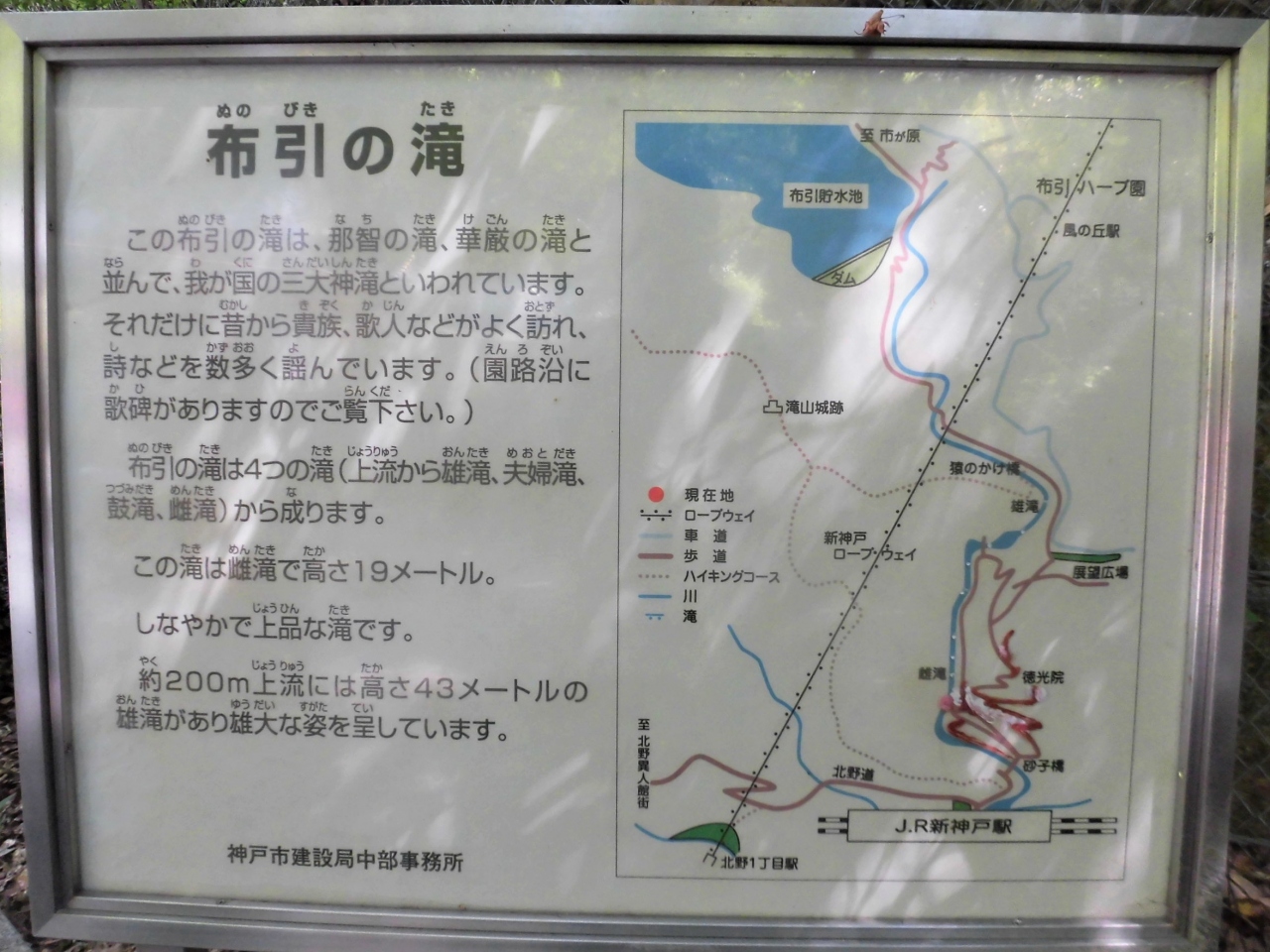 新幹線の新神戸駅から歩いて10分ほど坂道を上ると雌滝に到着し、さらに上ると鼓ヶ滝、さらの上ると夫婦滝と雄滝に到着します。雄滝までは新神戸駅から約20分ほどで、子どもでも歩ける距離です。