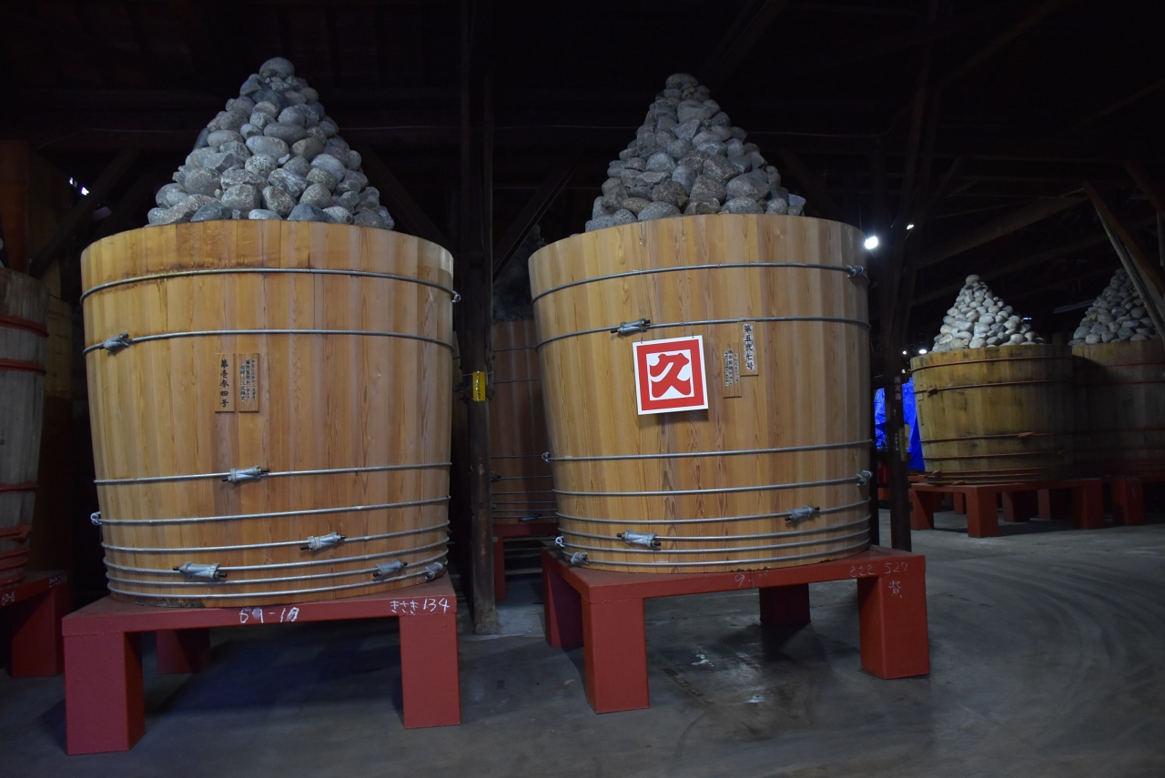 味噌蔵では大きな木桶に大豆麹・水・塩をあわせ、その上に重たい石をピラミッドのように積み重ね、2年間寝かせると八丁味噌ができあがります。