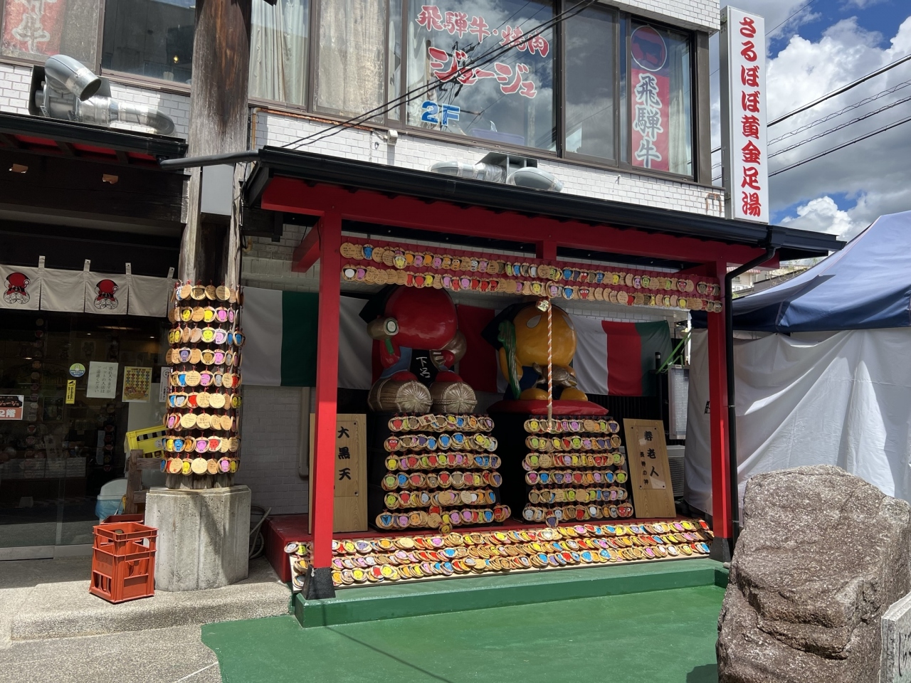 白鷺橋近くの阿多野通り沿いに、さるぼぼ七福神社があります。しらさぎ横丁を入ると、七福神の衣装をまとった「さるぼぼ」(猿の赤ちゃんをモチーフにした飛騨高山の民芸品)が点々と置かれています。横丁の奥には拝殿や、さるぼぼの足湯などもあります。