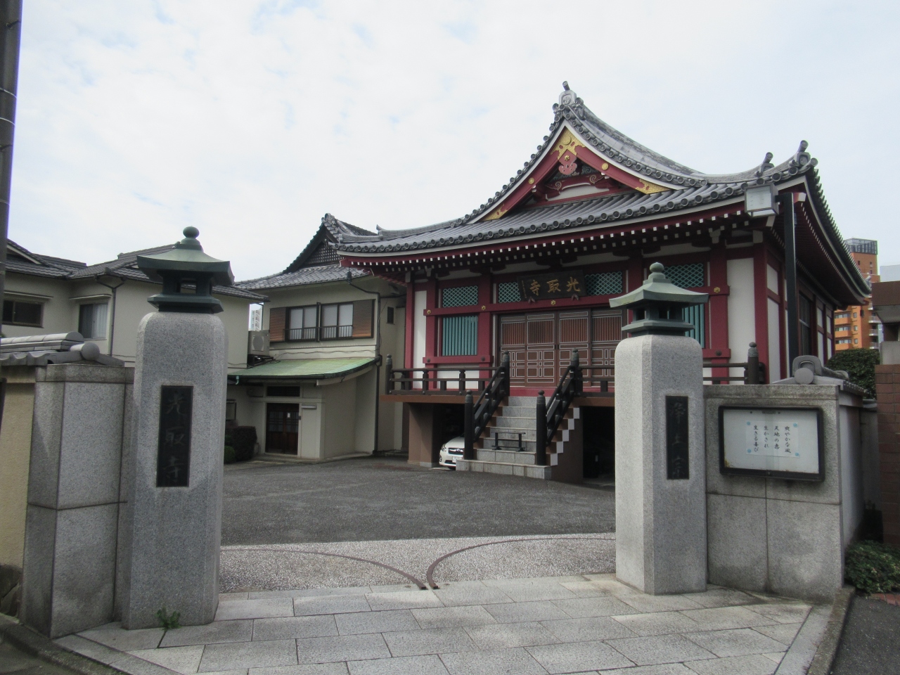 JR目黒駅から15分ほど、品川区と港区の区境に造られている芝増上寺小院群の一つです。閑静な住宅地に建っていて緑は少ないですが、朱色の柱と白壁の本堂が堂々とした印象を受けました。1624年、増上寺下屋敷に創建され、明暦の大火後に麻布狸穴に移転、その後、現在の地に移ってきました。寺の外壁に子守地蔵が祀られています。