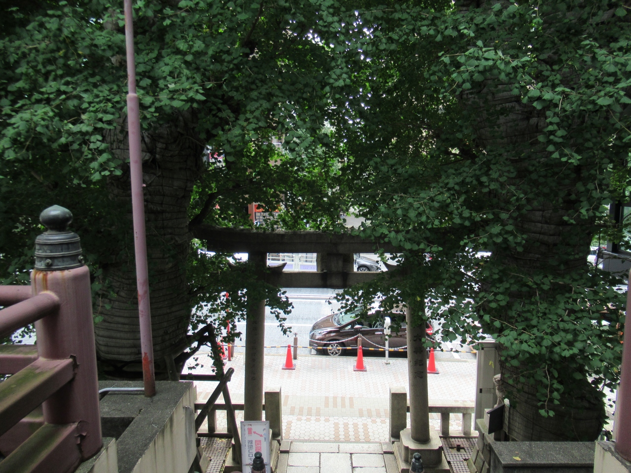 JR目黒駅から2分ほど、目黒通り沿いに建つ神社で、説明によれば、1400年代後半に福岡県から勧請されたとのことです。階段を上がった先に建つ社殿には新しい神輿が2基保管、飾られていました。境内らしきスペースはほとんどありませんが、神社入口に建つ鳥居の横には、推定樹齢300年、樹高15mほどの2本の銀杏が境内を覆うようにして生育しています。