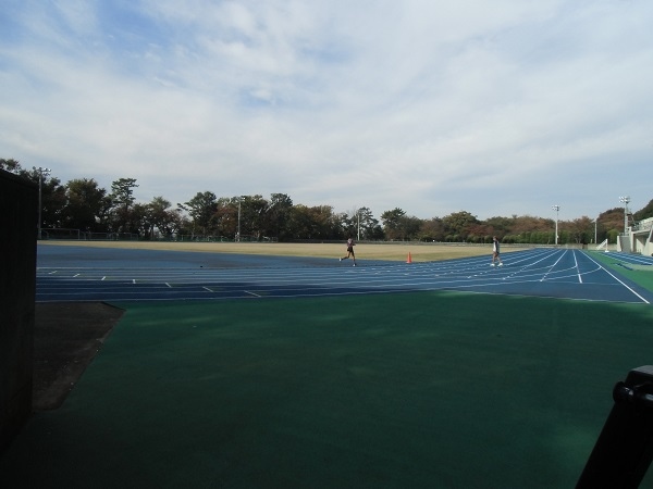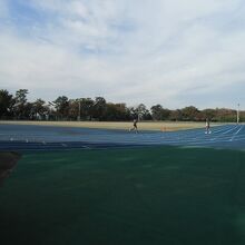大きな観客席がある、ブルーのトラックが目を引く非常に走りやすそうなと競技場です。