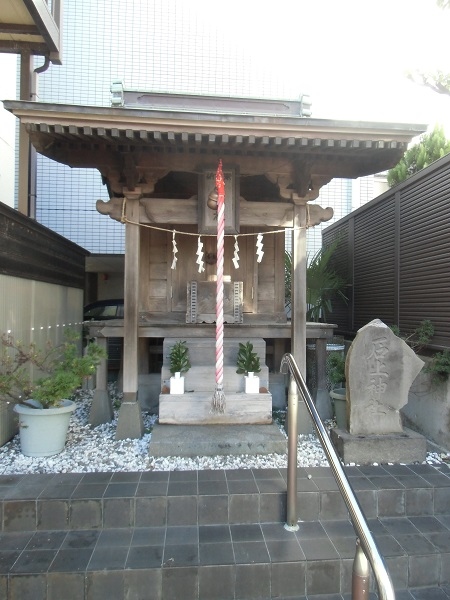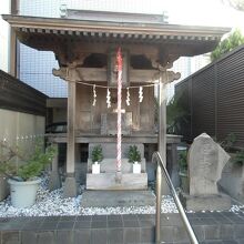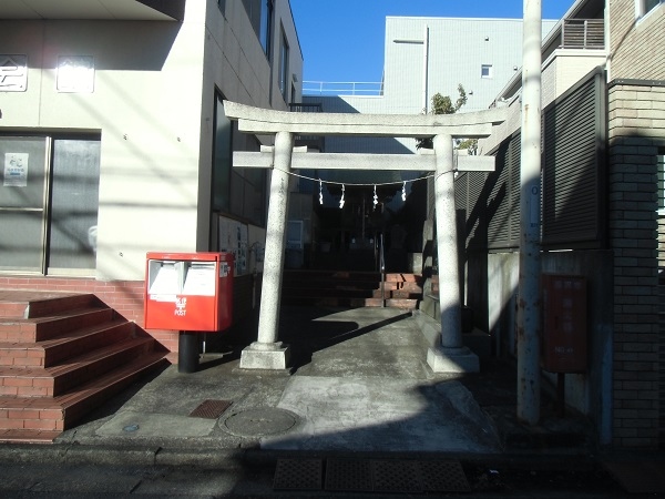 建物に挟まれ、石の鳥居と祠のみの小さな神社です。