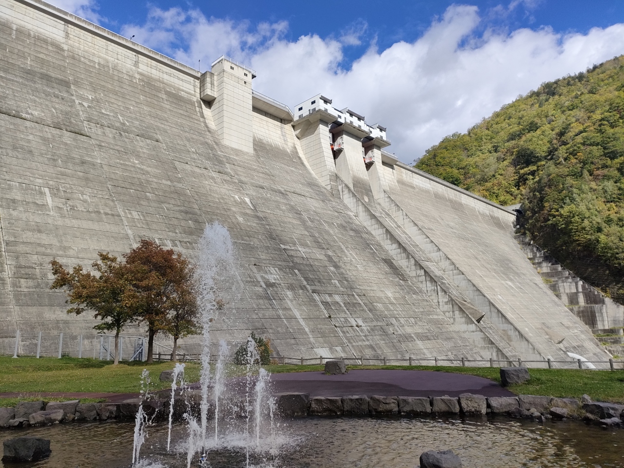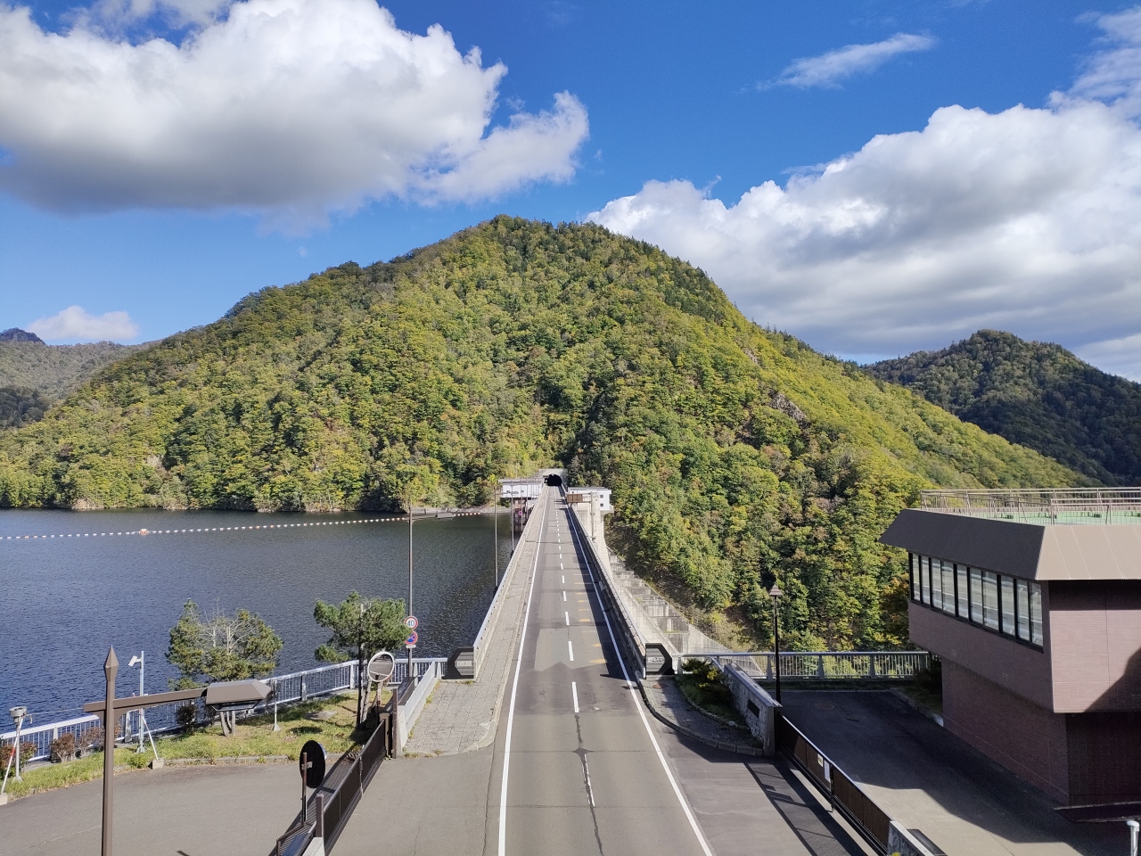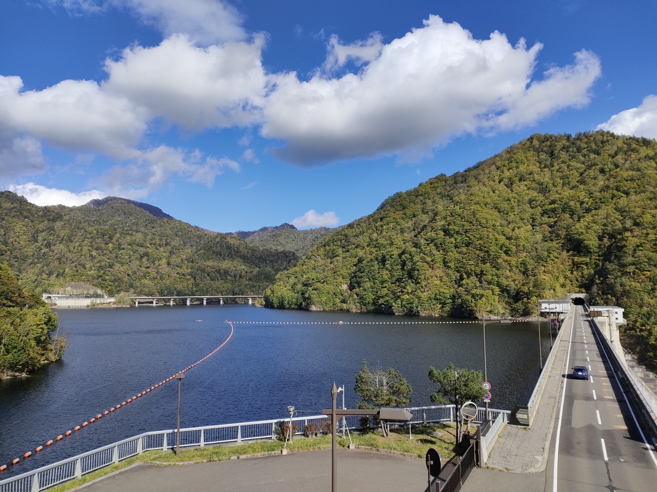 2022年は10月10日前後の紅葉の状況はまだ浅め。さっぽろ湖畔沿いの山肌はやや黄色っぽくなってきたものの、全体がまだ緑が濃い感じでした。そのちょっと前、10月6日には近くの中山峠(標高835m)で初雪となりましたが、標高400m付近(定山渓ダム堤体で標高392m)のさっぽろ湖では、周囲が真っ黄色になる紅葉(黄葉)見頃にはあと1週間ほど要しそうな雰囲気でした。