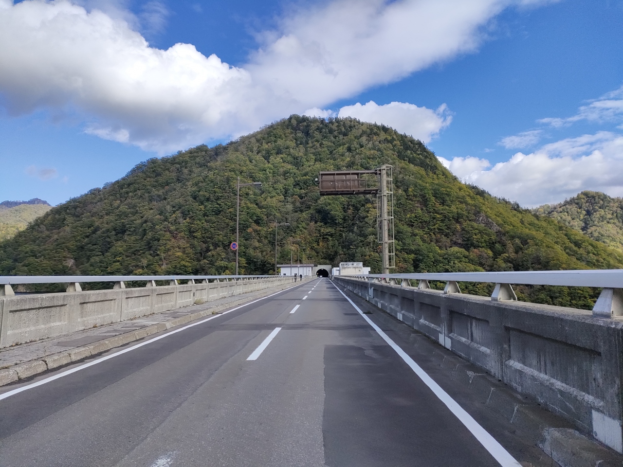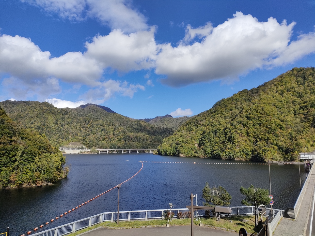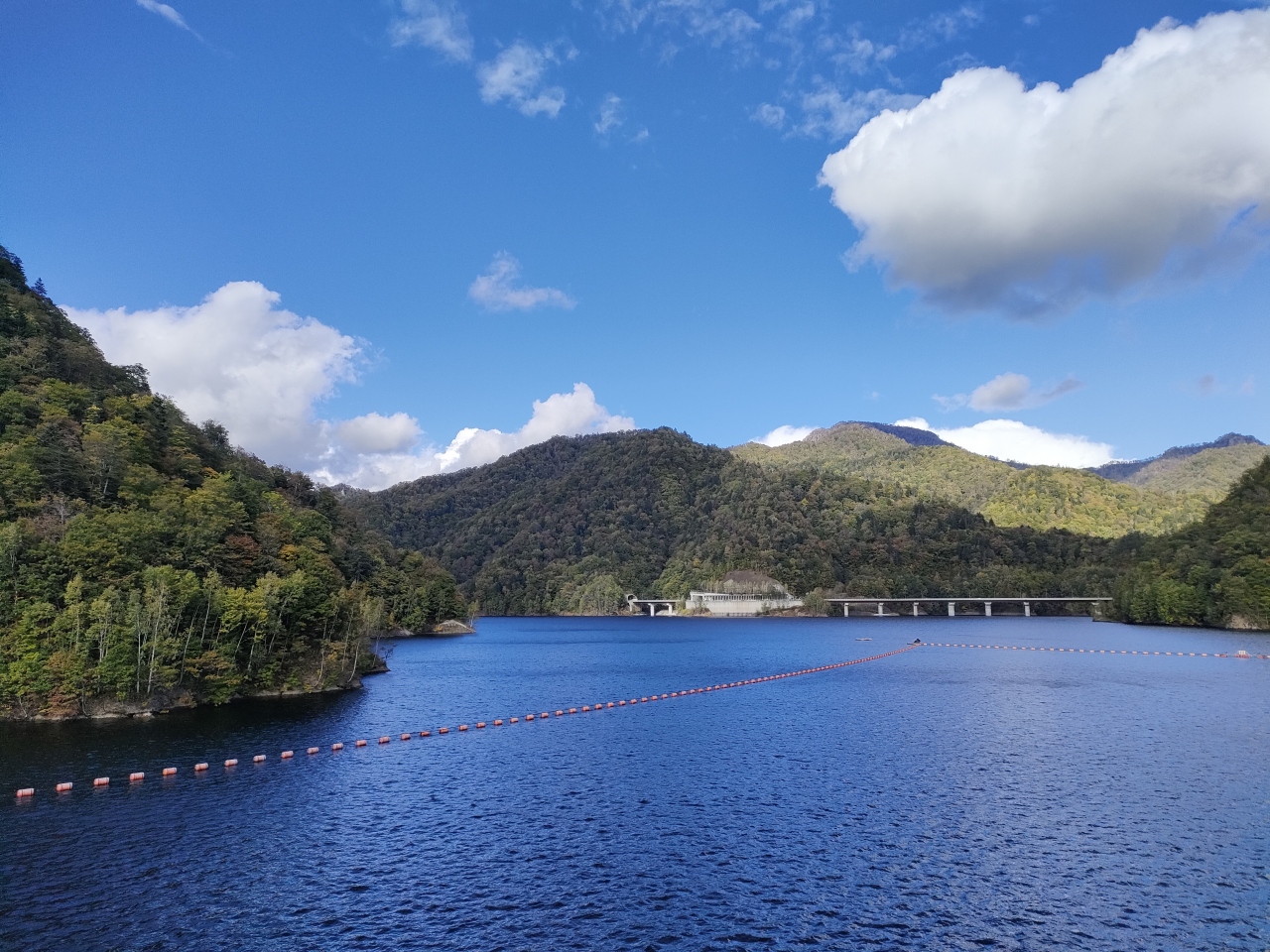 2022年は10月10日前後の紅葉の状況はまだ浅め。さっぽろ湖畔沿いの山肌はやや黄色っぽくなってきたものの、全体がまだ緑が濃い感じでした。そのちょっと前、10月6日には近くの中山峠(標高835m)で初雪となりましたが、標高400m付近(定山渓ダム堤体で標高392m)のさっぽろ湖では、周囲が真っ黄色になる紅葉(黄葉)見頃にはあと1週間ほど要しそうな雰囲気でした。