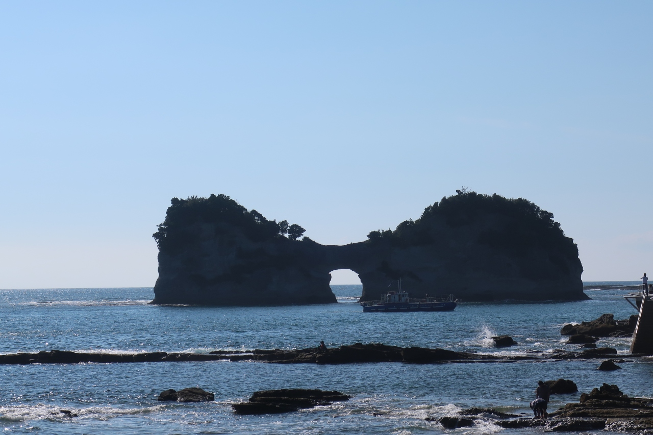 南紀白浜の名勝の一つです。三段壁、千畳敷とともに「円月島(高嶋)・千畳敷・三段壁」の名称で国の名勝に指定されています。夕景の名所としても知られていて、春分・秋分の時期には、中心部の穴を通して夕日が見えるそうです。私は昼間にみたので、あんまりおもしろくない風景でした。