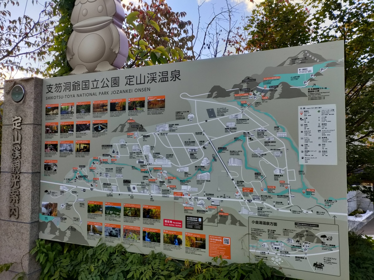 定山渓の温泉街では、公共の足湯(無料)が、手湯よりも手前(札幌側)の同国道沿い(足のふれあい太郎の湯)のほかに、手湯から温泉街へ下りていった源泉公園、橋を渡って突き当たった岩戸観音堂の横(足つぼの湯)の合計3カ所にありますが、靴下を脱いだり足を拭いたりする手間のある足湯より、手湯は簡単に楽しむことができます。
