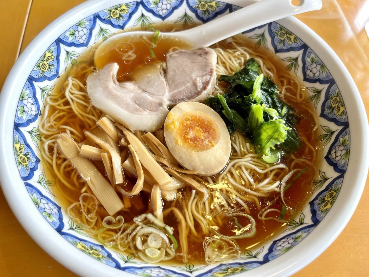 スープは確かに鶏ガラでやや甘い感じ、麺は硬めの茹で加減でチャーシュー、ナルト、ほうれん草と半熟玉子が乗っていました