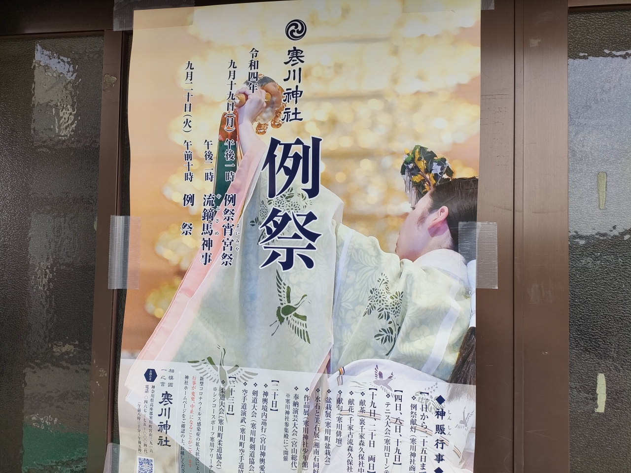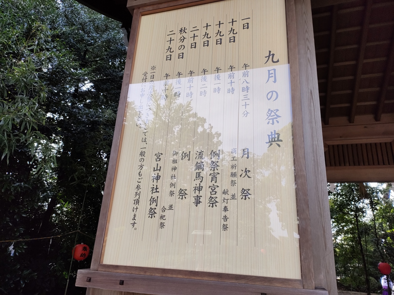 毎年9月20日が例祭日で、前日の19日には例祭の一環で、境内西側の馬場で流鏑馬も行われますが、令和4年(2022年)は台風の影響による雨で、当日は天気が回復したものの馬場の状態が悪く、中止となりました。