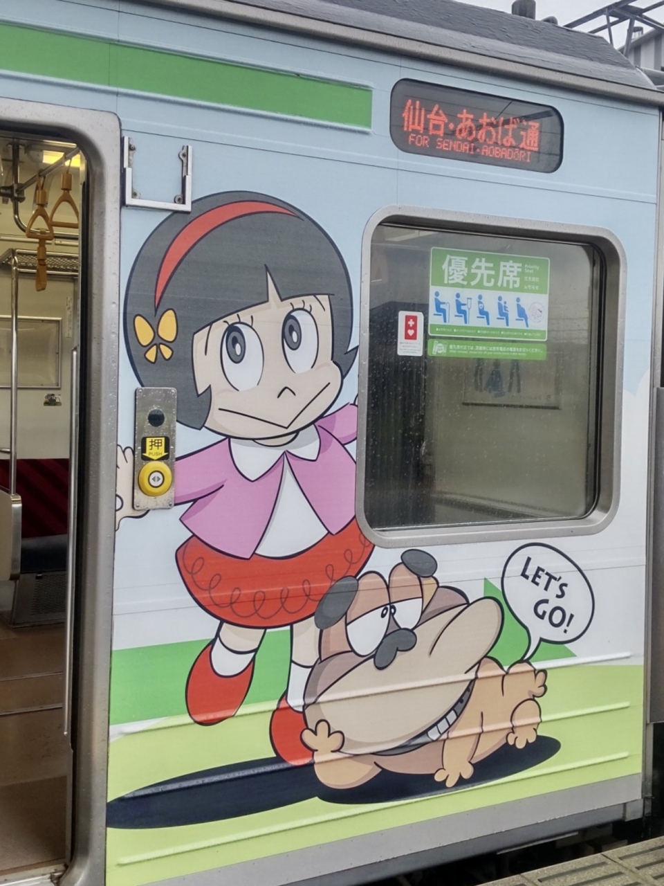 仙石線は、仙台を結ぶJRローカル線で、石ノ森章太郎作品のキャラクターが描かれた、ラッピング車両「マンガッタンライナー」が運行されています。4両編成の、マンガッタンライナーは、サイボーグ009列車、時代劇列車、コメディー列車、ヒーロー列車の4種類あって、乗ったのはヒーロー列車で、コメディー列車を仙台駅で見かけました。乗車区間は、仙台から松佐島海岸までで、所要時間40分、418円でした。