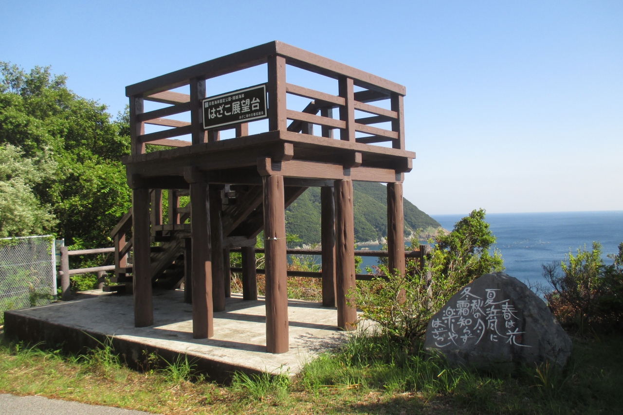 間越海岸近くの高台に「はざこ展望台」がありました。ここからは米水津湾が、そして、間越海水浴場も一望でした。展望台の足下に、「春は花、夏は浜風に、秋の月、冬霜知らず、楽しやはざこ」と歌が刻まれた石が置かれていました。道元禅師の「春は花 夏ほととぎす・・・」の替え歌のような感じです。でも、これは間越海岸を言い得ているのでしょうね。