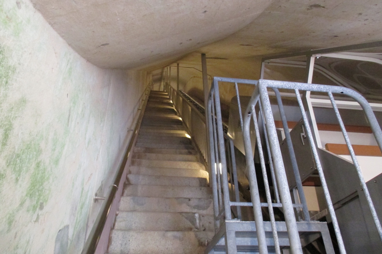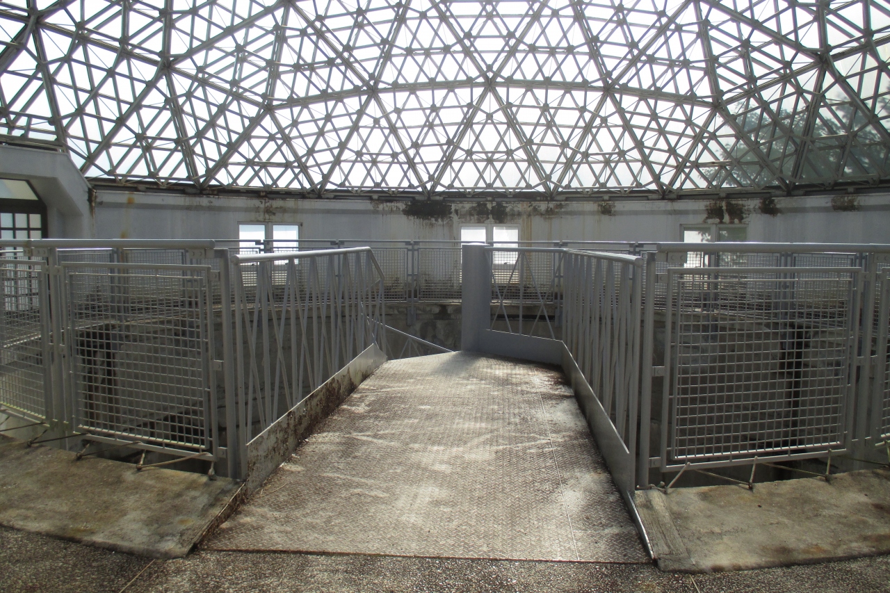 砲台跡登口からは長さ80mの斜坑を、リフトで3分掛けて上ります。元々は横の地下弾薬庫から運んできた砲弾を運び上げるコンベアが敷設されていたそうです。並行する階段は162段あるとのことです。上がったところが砲塔井の底です。深い砲塔井の上部にはガラスの丸屋根が付けられていて、らせん階段で上がり、外に出ることが出来ました。砲身が向けられていたという、狭い元の間海峡などが見られました。この砲台は実戦配備後に大事故が発生して、そのまま廃棄されたそうですね。もし、事故がなくても実戦で使われることはなかったのですね。