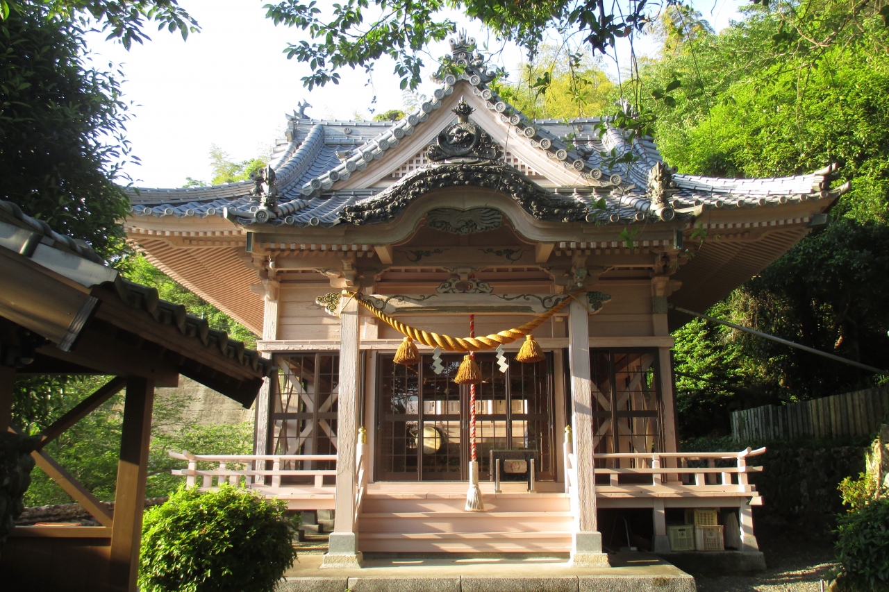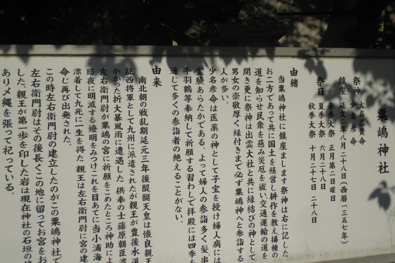 米水津の粟嶋神社は、社殿は風雨に晒されれば相応に艶を失っていくと思いますが、この社殿は何か明るい感じに見えました。どうやら薄~いピンク色の塗装が施されている様です。港のすぐ横のちょっとした高台にありますから、港を出入りする船からはかなり目立つ存在なのだと思います。こちらの神社は14世紀の創建と伝わっているそうで、場所から言っても、その当時は航海の神様を祀っていたのではないかと思います。後には、国造りの神様が祀られていて、安産や縁結びの神様として知られているそうです。江戸時代には佐伯藩のお女中も参拝することが許されていたのだそうです。といっても、お城からは相当離れていますから、宿下りといった時間の取れる時に限られると思いますが・・・。