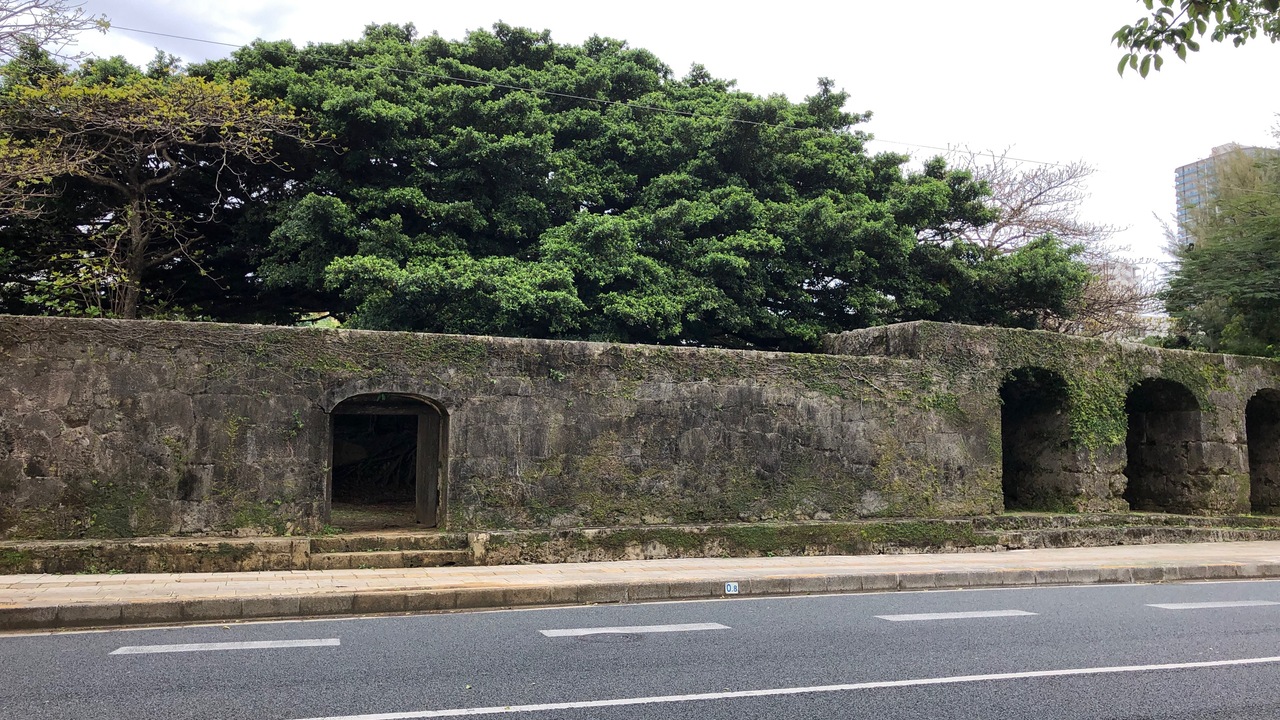 安里三叉路の近くにある、古い石門です。戦前は、崇元寺がありましたが、沖縄戦でなくなってしまいました。現在は、石門が残るだけです。石門は自由に見学できますが、草木がうっそうと茂っており、昼間でも暗い雰囲気です。