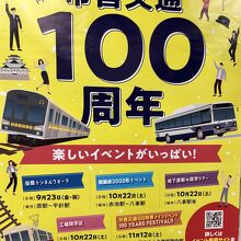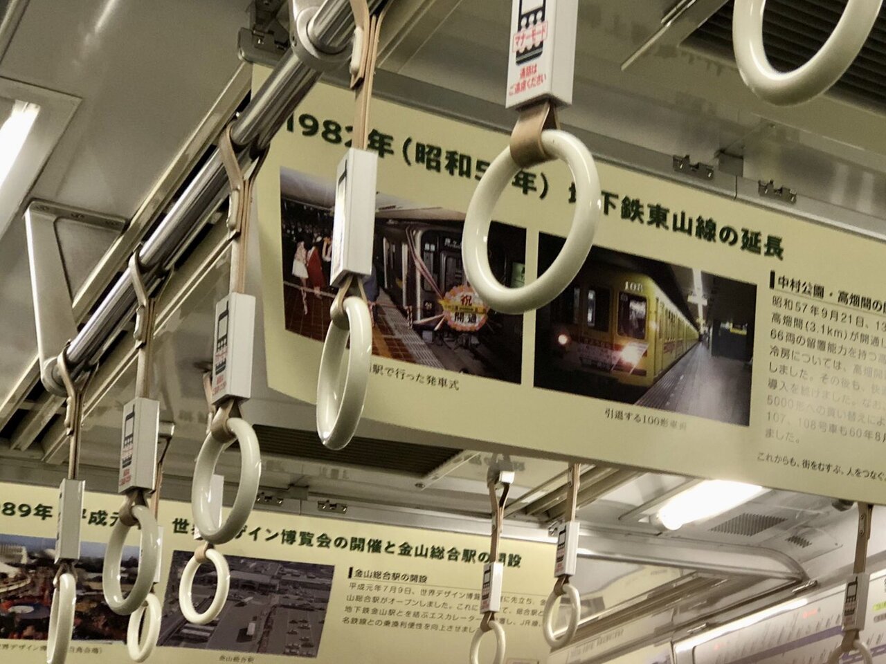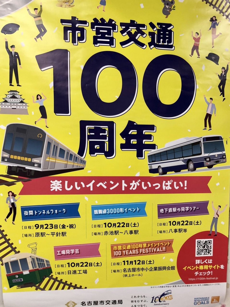 名古屋出張で、市営地下鉄に乗りました。やってきた電車は、黄色一色!懐かしいですね。駅のポスターを見て、名古屋市営交通100周年記念のイベント企画の一つのようです。この列車、色は黄色だけど中身はいつもの冷房の効いていない車両。期間中、トンネル内を歩いたり、工場見学会などのイベントがあるようです。