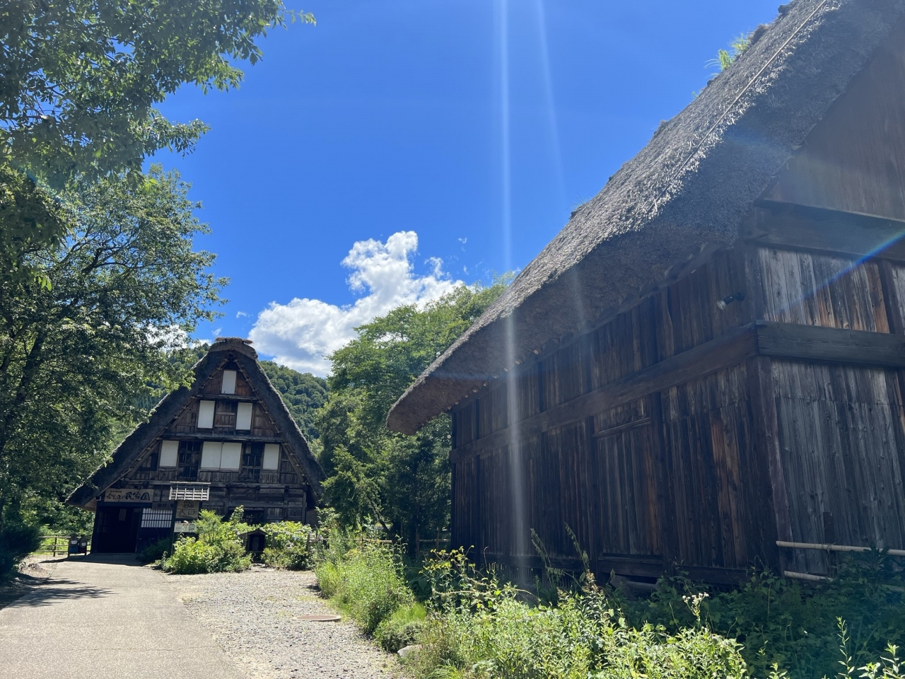 せせらぎ公園や村営駐車場があるエリアに、合掌造り民家園(入園料大人600円)があります。26棟の合掌造りの家屋(うち9棟は、県指定重要文化財)が近隣の飛騨地方から移築され、寺社や水車小屋などとともに、模擬的に集落が造られています。