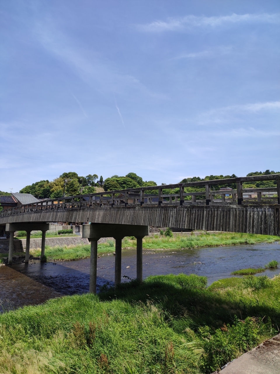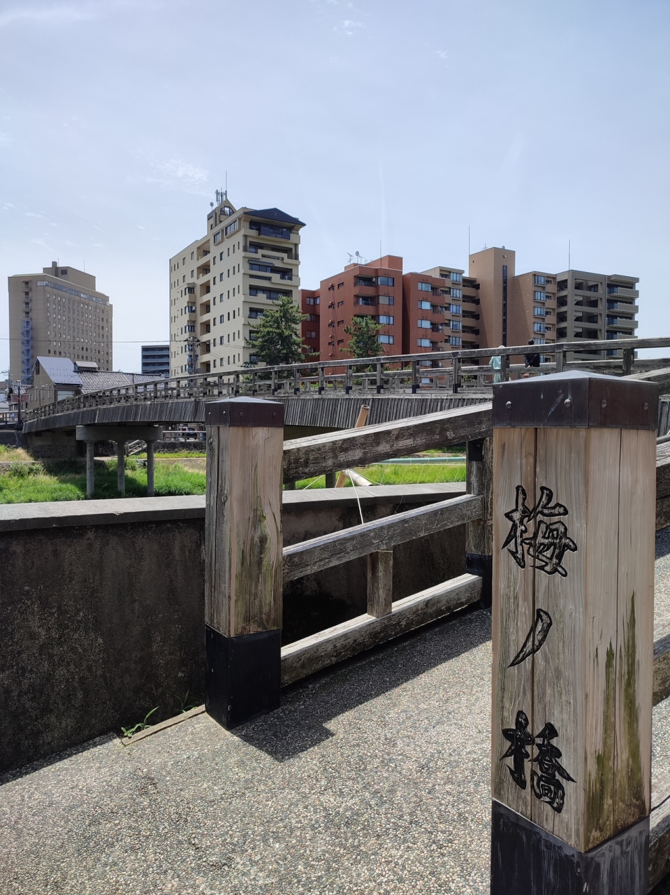 浅野川大橋から川の上流方向に歩いて行くと次にある歩行者専用の橋です。この橋を渡って金沢の茶屋街でも最も活気のあるひがし茶屋街へ向かいました。鋼橋で木製ではみたいですが、周辺の環境にマッチする雰囲気になってました。