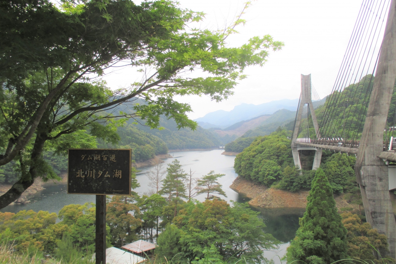 北川ダム湖は、北川に築かれた北川ダムによって出来たダム湖です。ダムの場所は県境に近い大分県側に築かれていますから、北川ダム湖はすべて大分県となります。国道326号線を走ると、北川ダム近くにある梅の里橋(約108m)で1回、道の駅・宇目近くにある唄げんか大橋(292m)でもう1回、北川ダム湖を渡りました。1つの道で同じダム湖を2回渡るのは珍しいと思いました。