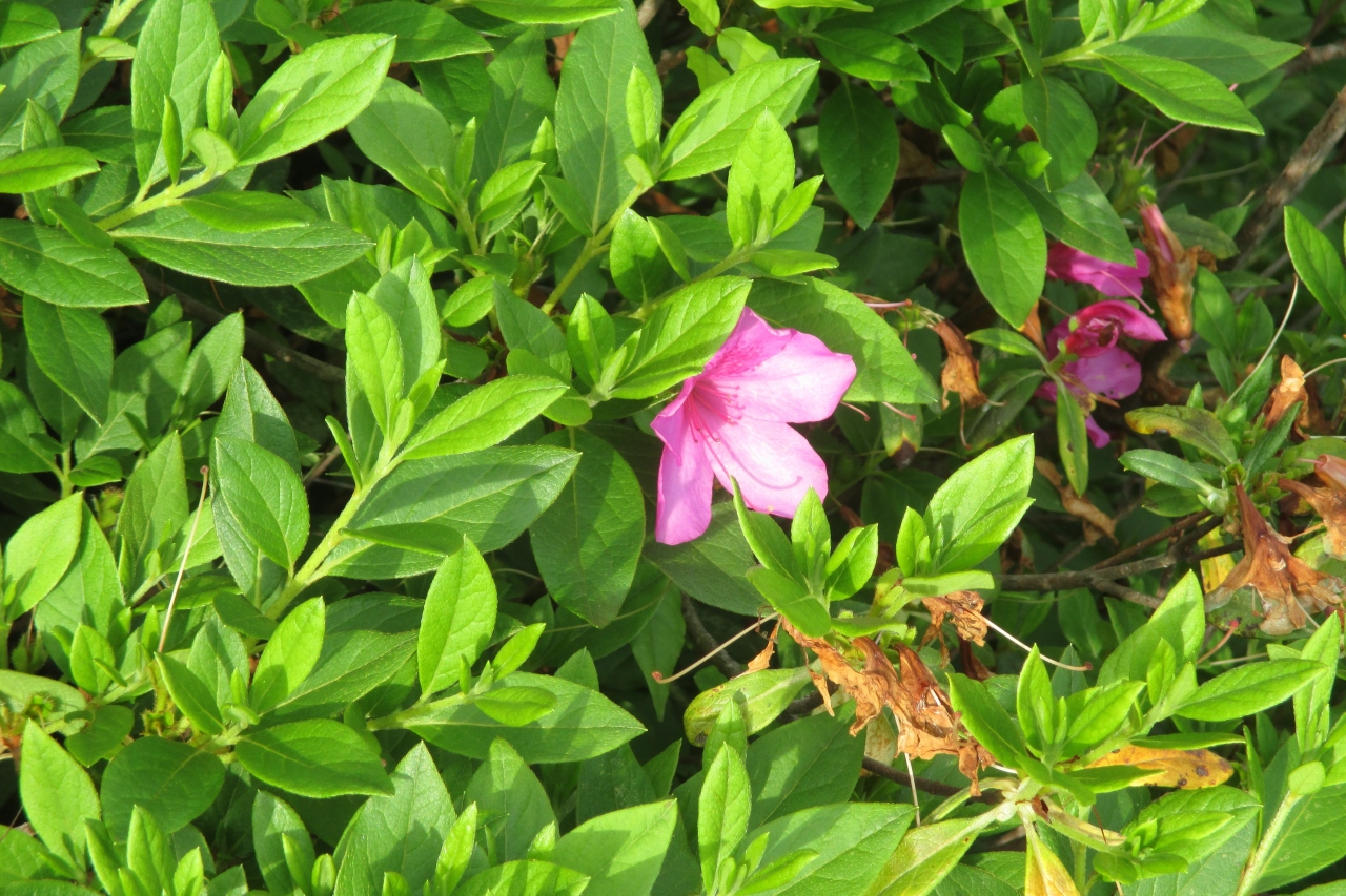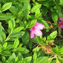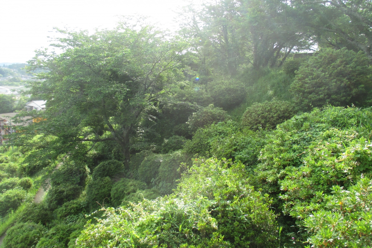 大原公園は、豊後大野市三重町の町並みの北部台地に拡がる大原総合公園の中にありました。別名をつつじ公園というそうで、総合公園の1番南、台地の斜面につつじが植えられていました。訪れた時はつつじの開花は終わってしまっていて、後れ咲きが一輪、二輪といったところでした。ここは台地の端なので、三重町の町並みが一望でした。公園の最上部から少し階段を降りたツツジの中に、台形に張り出したコンクリート造りのものがありました。何かと思ったら、これは弓の射場でした。ここではツツジ射会が行なわれるとのことです。台地の端にある大原弓道場が開催するもので、ツツジの開花時にこの射場から遠的をするのだそうです。自然の中ですから爽快でしょうね。但し、大原弓道場は臨時?休館中でしたし、ツツジの手入れもされていない状態でしたから、ここ何年かはやっていないのだと思います。