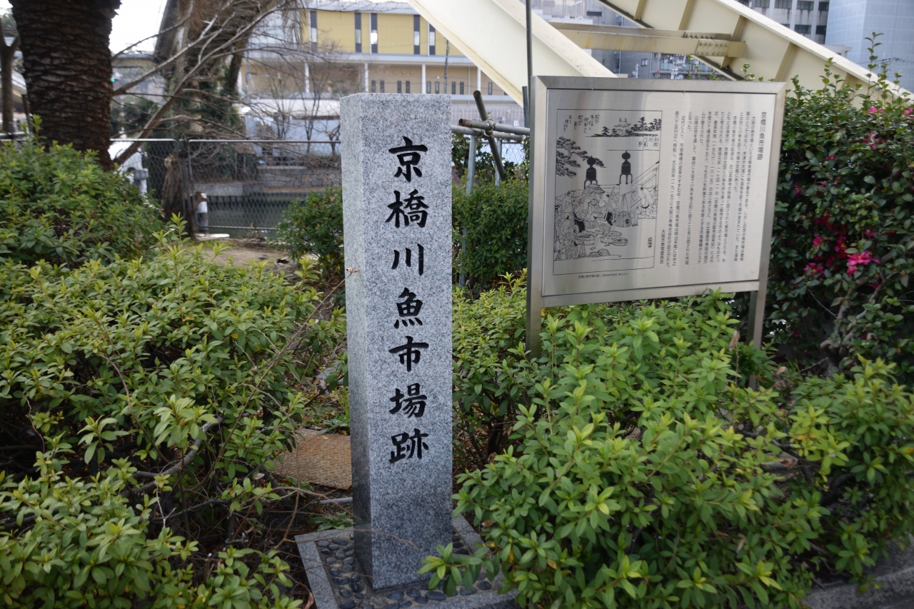 寝屋川に架かる京橋の近くにある魚市場の石碑です。江戸時代にはこの場所で魚市場があり、賑わっていたそうです。水揚げされた魚を市民に販売する魚市場はこのあたりにたくさんあったそうです。明治時代の頃に移転されたそうです。