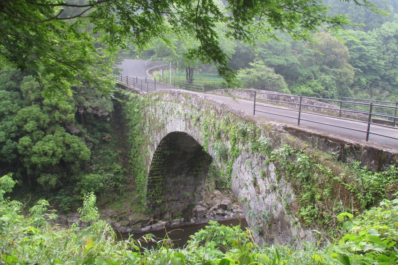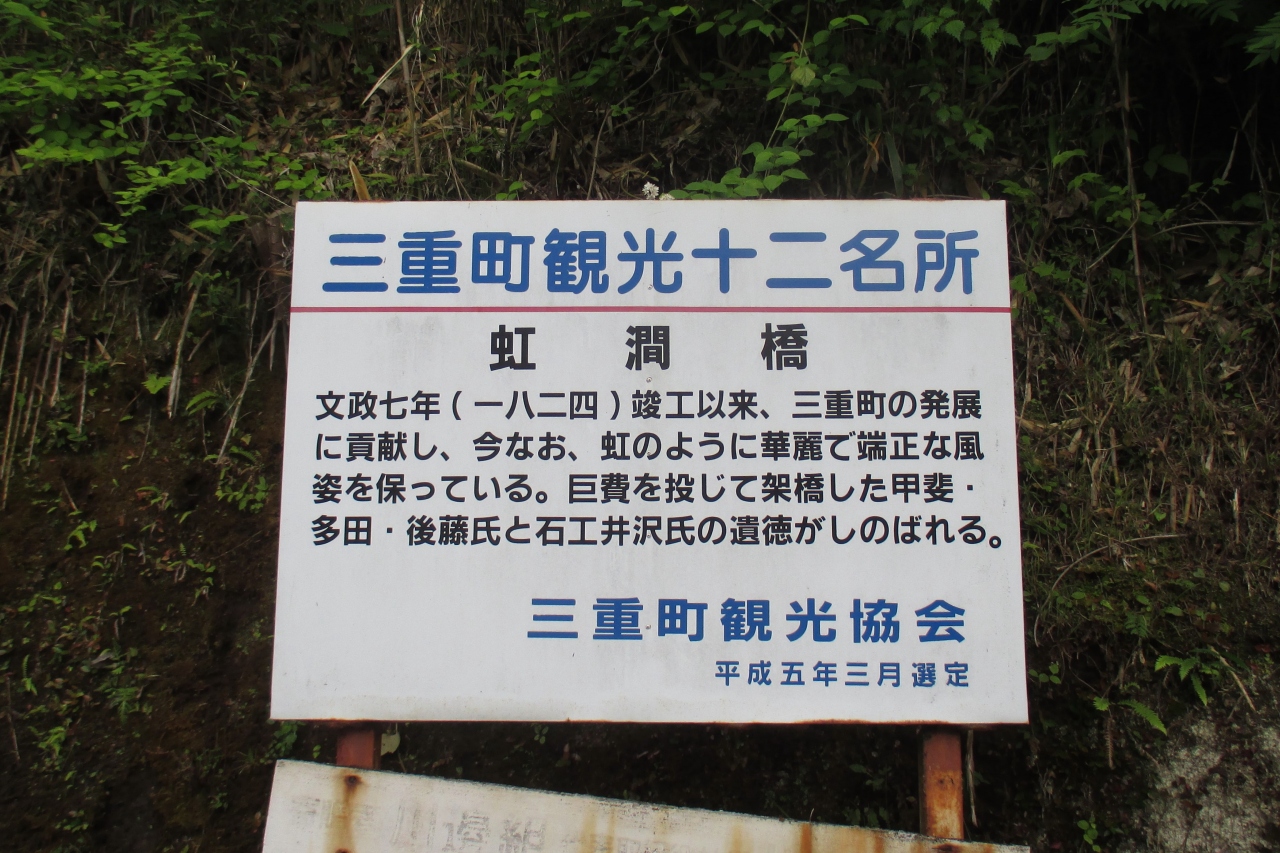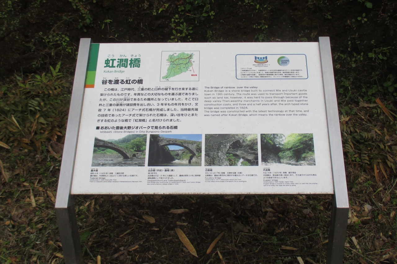虹澗橋は三重川に架かっていました。澗は「たに」とか「たにみず」と読むのだそうですね。正に、谷に懸かった、ほぼ半円の虹の様な美しい橋ということなのでしょう。横から見ると、元々の橋は太鼓橋というほど極端ではありませんが、上面も中央が膨らむアーチだった様です。近年の通行に供するため橋の袂部を嵩上げして平らにした様です。ここは臼杵藩内の主要街道筋ですが交通の難所だったところで、藩内の3人の豪商がお金を出し合い、1824年(文政7年)に架けられたとのことです。1988年(昭和63年)に国道502号線の新虹澗橋が出来てからも、2003年(平成15年)まで現役で使われていたそうですから驚きです。1999年(平成11年)に国指定の重要文化財となっています。右岸側の袂に石碑「虹澗橋記」がありました。埋まってしまっているため背が低く,字も読めませんでしたが、原文となるものが臼杵市歴史資料館にあるそうです。(訪れた時は見落としました)