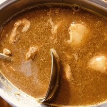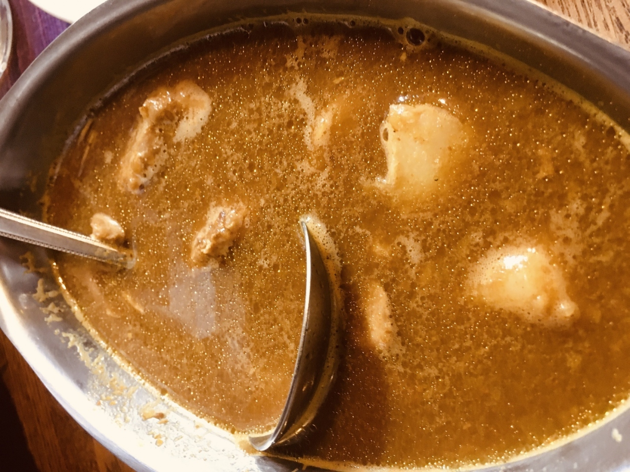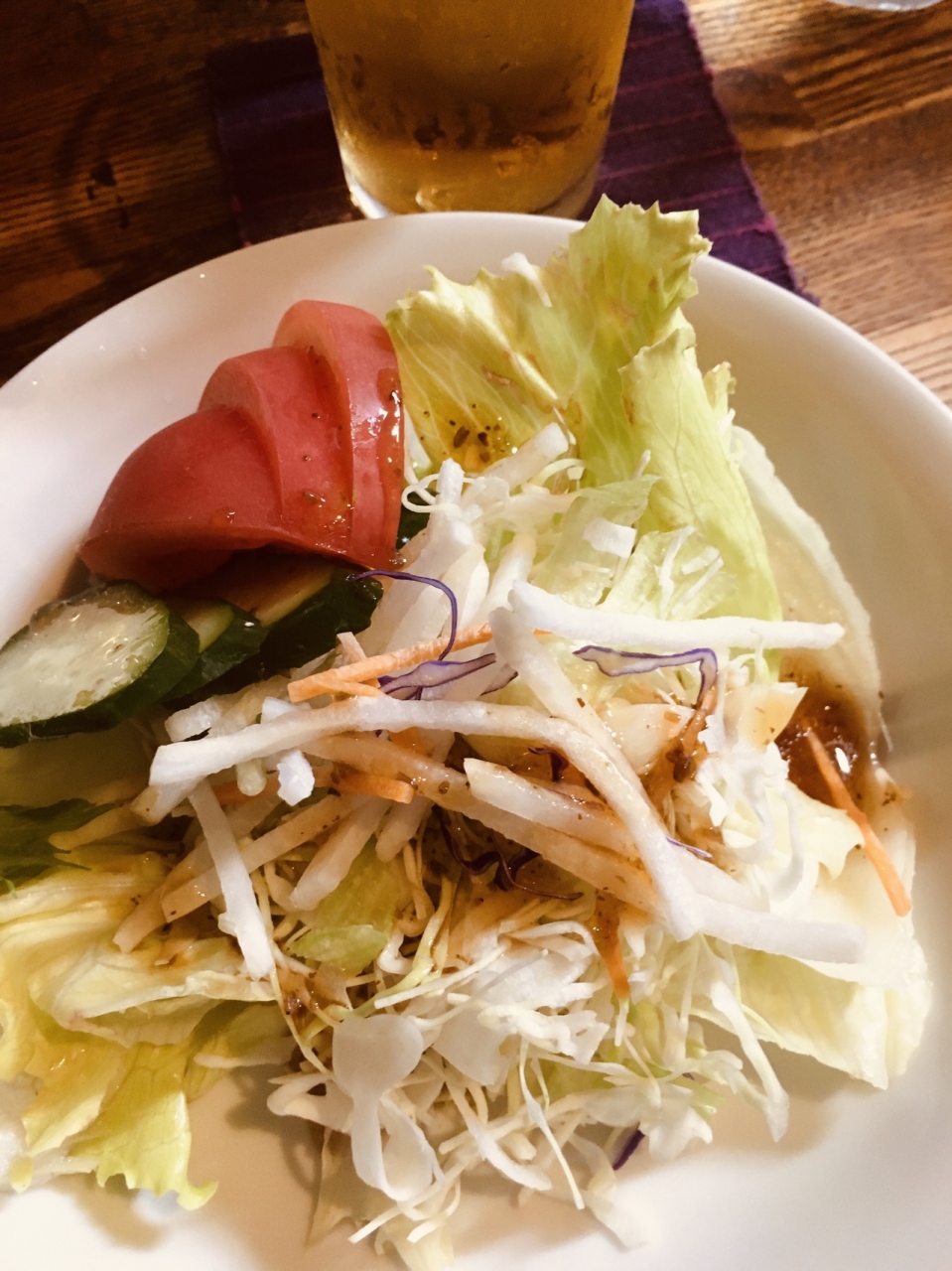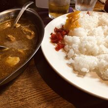 カウンター7~8人も入れば満席のカレー専門店です。まずはビールとサラダで一杯やりました。パキスタンカレーと言うのもメニューにありましたが、インド風のチキンカレーを食べました。辛さは中辛でしたが少しピリ辛感がありましたがサクッと食べれました。ご飯とカレーは別皿で、ご飯にカレーを掛けて食べました。水分が多いルーです。