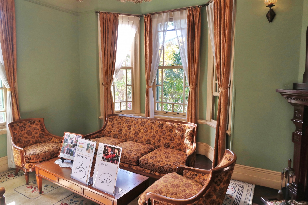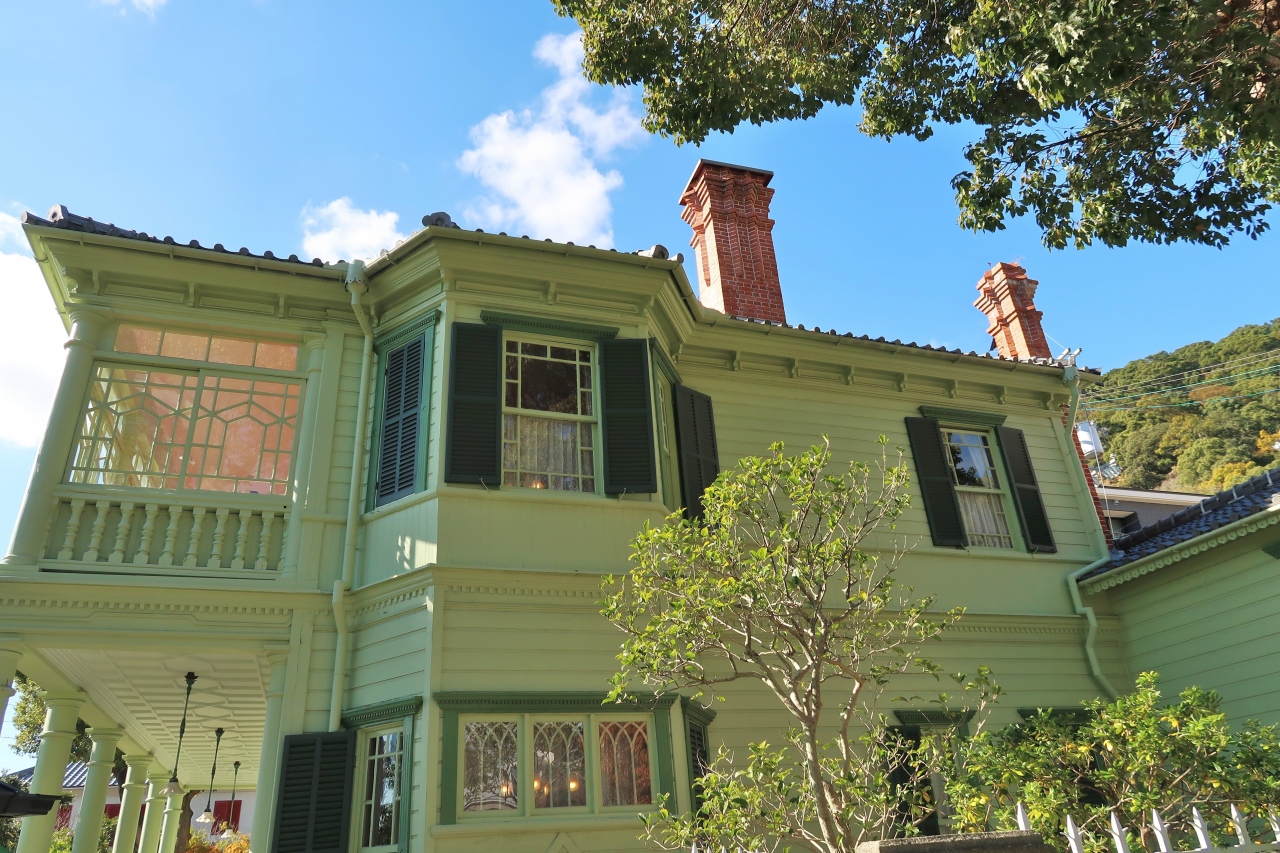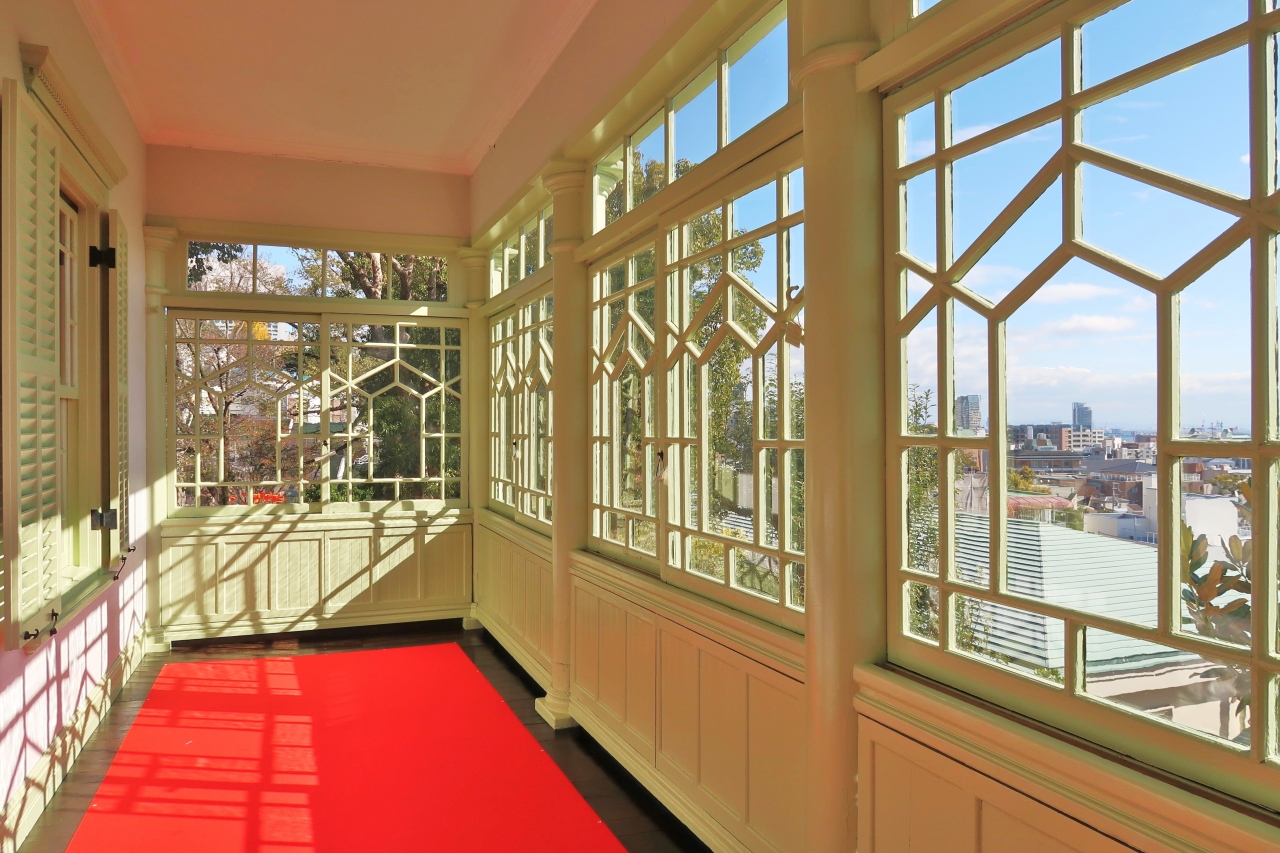 明治36年に建てられたアメリカ総領事ハンター・シャープ氏の邸宅で、うぐいす色の外壁が軽やかな印象を醸し出しているコロニアル様式の洋館です。1階のベランダで靴を脱いでから見学するようになっていました。2階のベランダは、幾何学模様の窓枠のガラス窓から冬の陽射しが差し込み、窓の向こうに広がる神戸の町並みを眺めることができます。