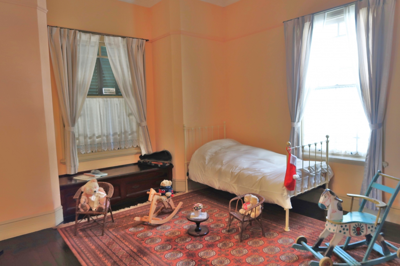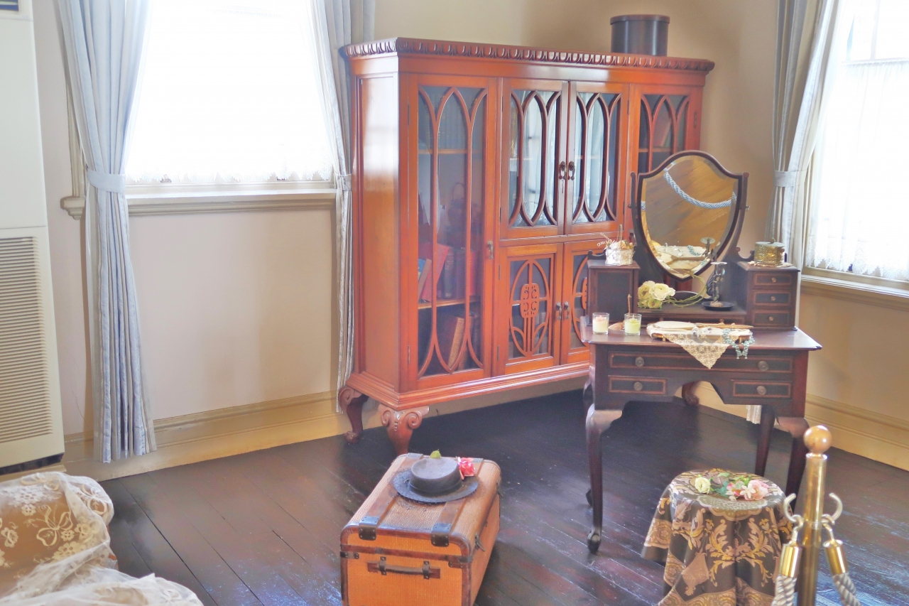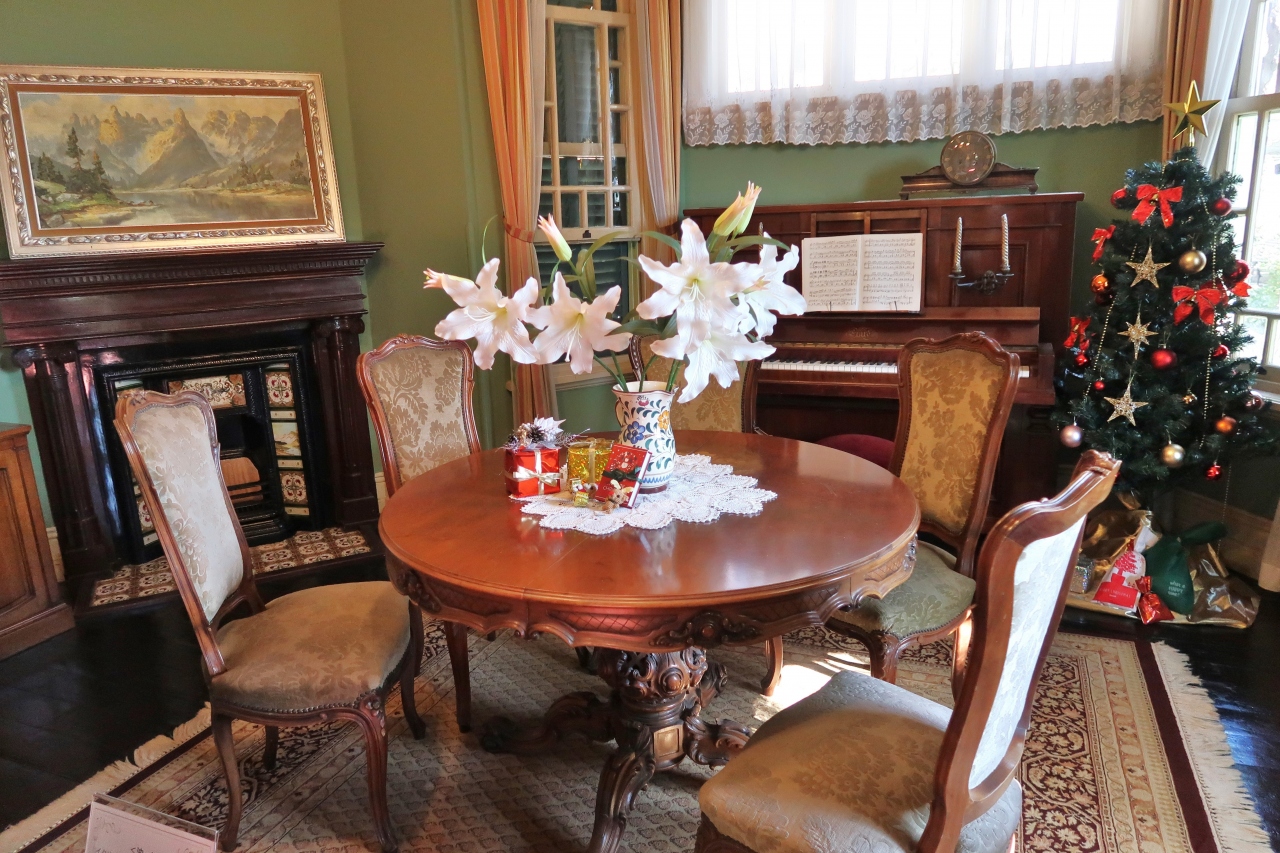 明治36年に建てられたアメリカ総領事ハンター・シャープ氏の邸宅で、うぐいす色の外壁が軽やかな印象を醸し出しているコロニアル様式の洋館です。1階のベランダで靴を脱いでから見学するようになっていました。2階のベランダは、幾何学模様の窓枠のガラス窓から冬の陽射しが差し込み、窓の向こうに広がる神戸の町並みを眺めることができます。