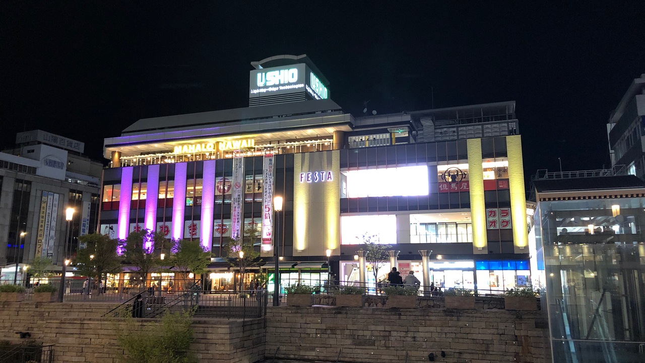 姫路駅前のショッピングモールです。地上部分の4階建ての建物を「フェスタ」、その地下街を「グランフェスタ」と呼びます。グランフェスタには、えきそば、姫路おでん、アーモンドトーストなど、姫路グルメが味わえる店が集まっています。