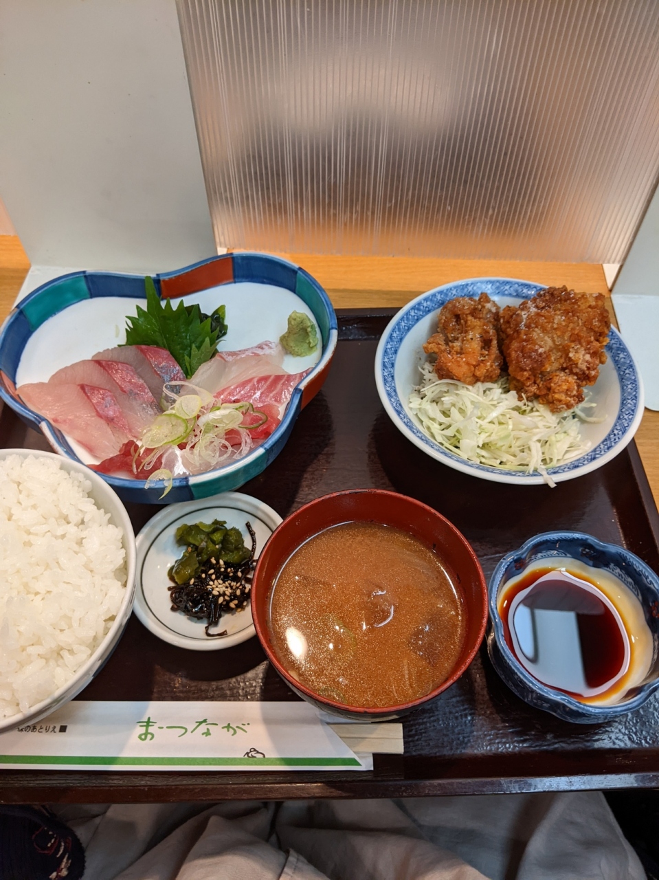 外にあるホワイトボードメニューで一番上にあるオススメ定食のツバスと鯛のお刺身と唐揚げ定食。隣のチェーンカレー店が混んでいて人混みに疲れる私は何も考えなくそれを注文しました。マグロもついてました。美味しかったです。ご飯は丼飯って感じでちょっと多めのお店でした。