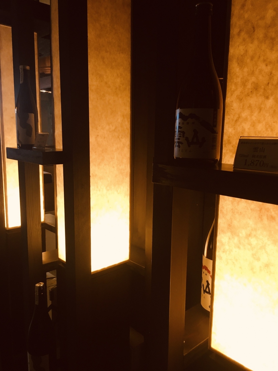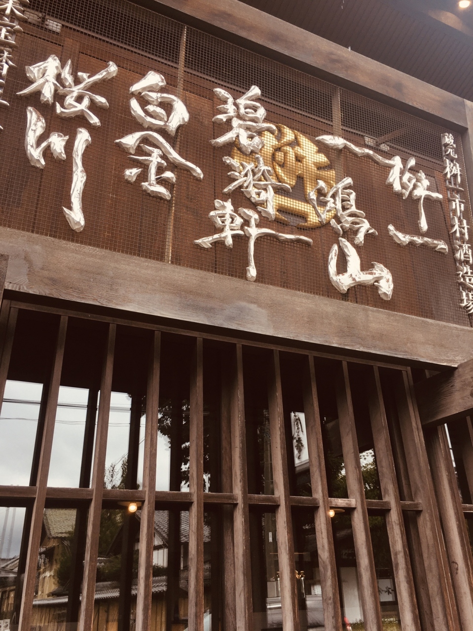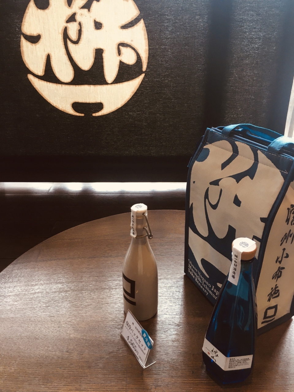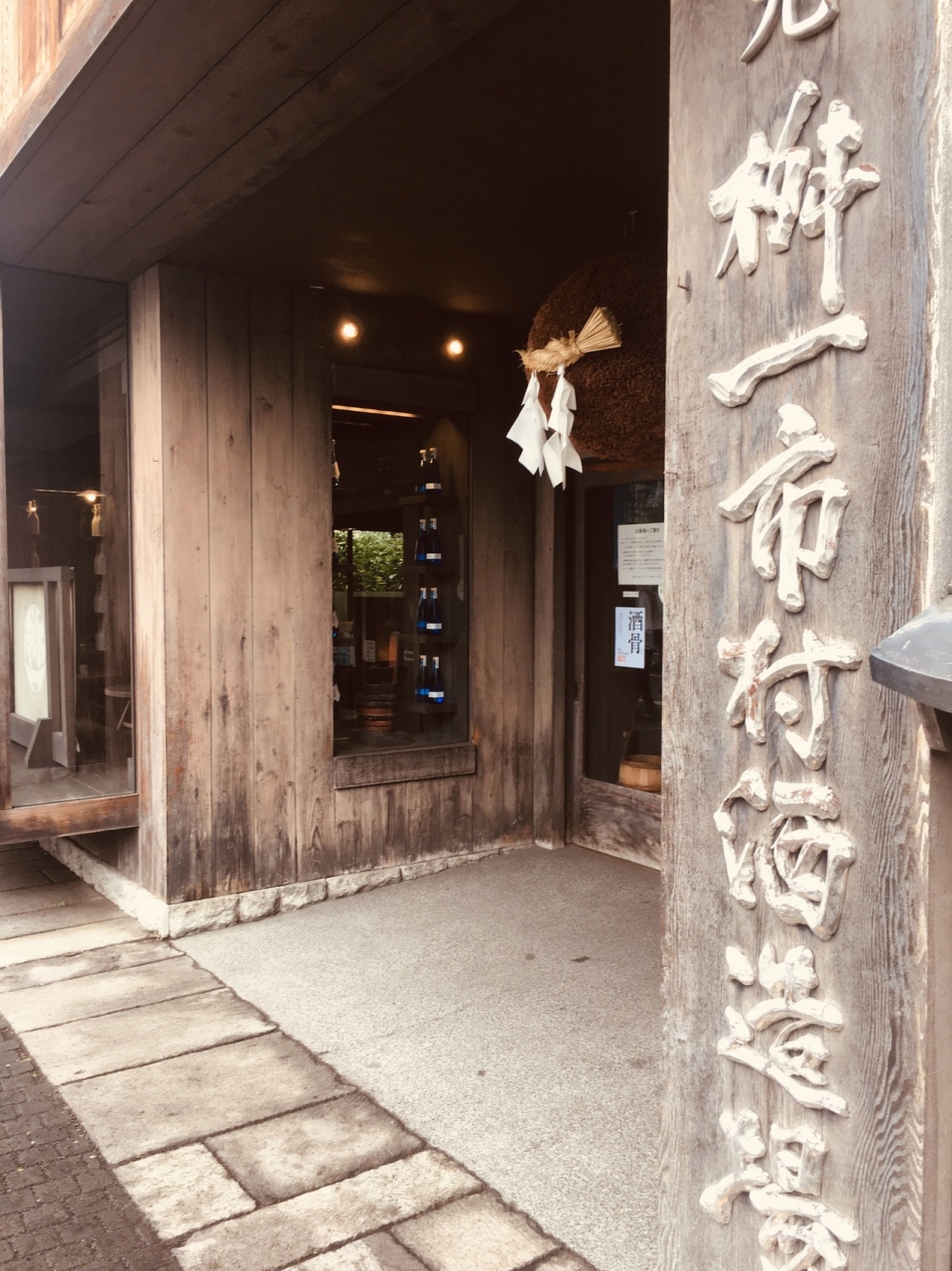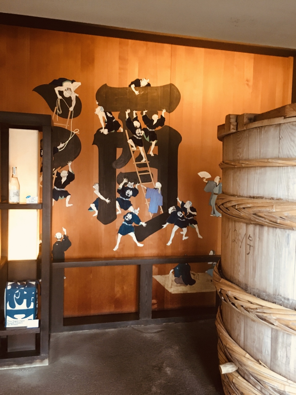 小布施の中心部に古い木造の建物があったので館内に入ってみました。暗めの館内で雰囲気があり、大きな坂樽が置いてありました。酒も売っていて高級感がある瓶が多数ありましたが、酒の品は少なめでした。酒樽の後方の絵は職人が多数描かれていました。