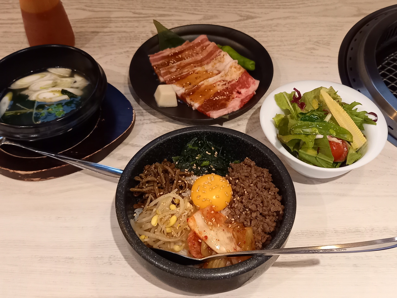 今回はビビンバランチのビビンバ·焼肉ランチ1100円をいただきました。スープとサラダも付いています。スープはプラス330円でハーフ冷麺に、プラス550円で冷麺かスンブゥドチゲに変更出来ます。